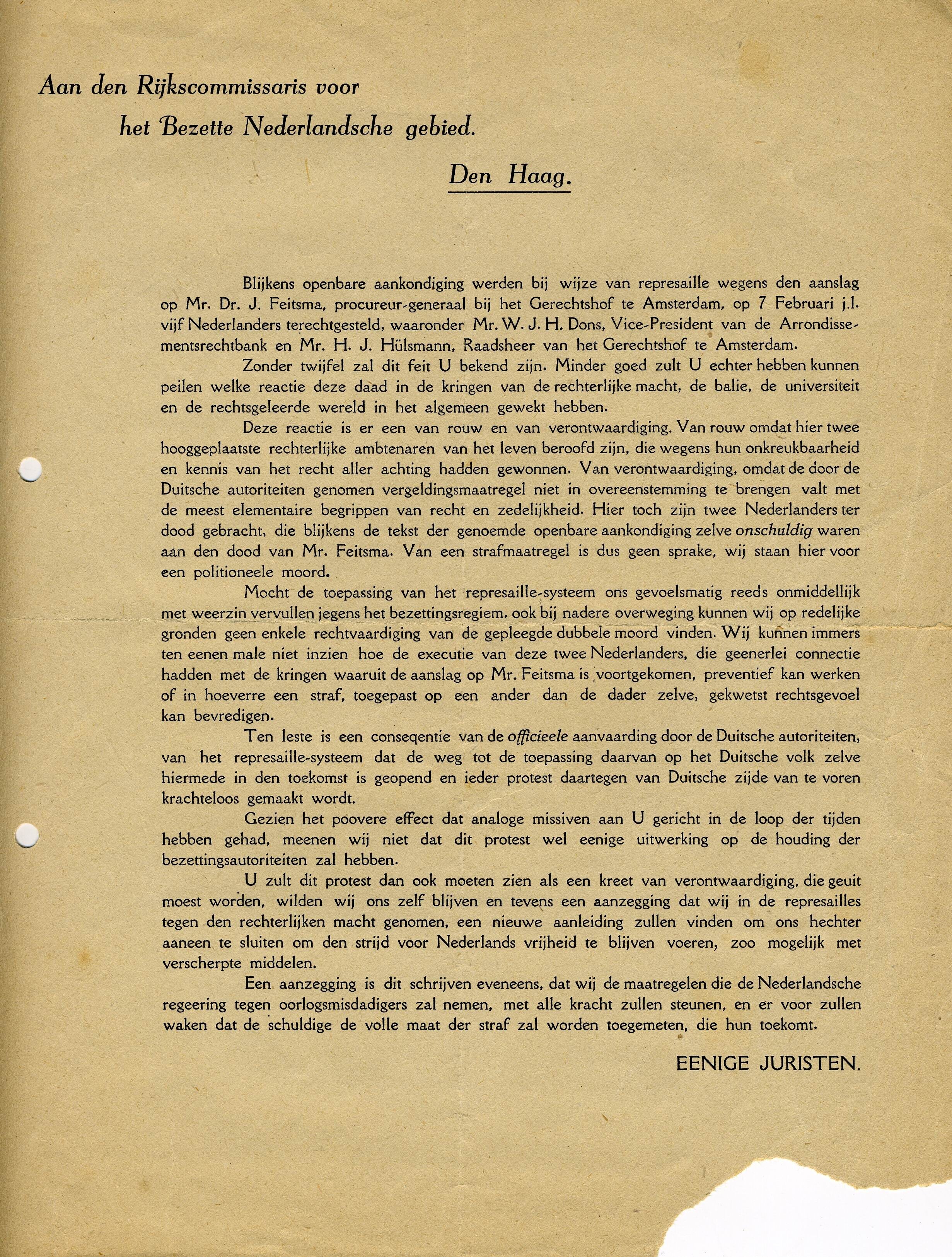 Een brief van "Eeenige Juristen" gericht "Aan den Rijkscommissaris voor het Bezette Nederlandsche gebied" vol kritiek op de wijze van orde- en rechtshandhaving.