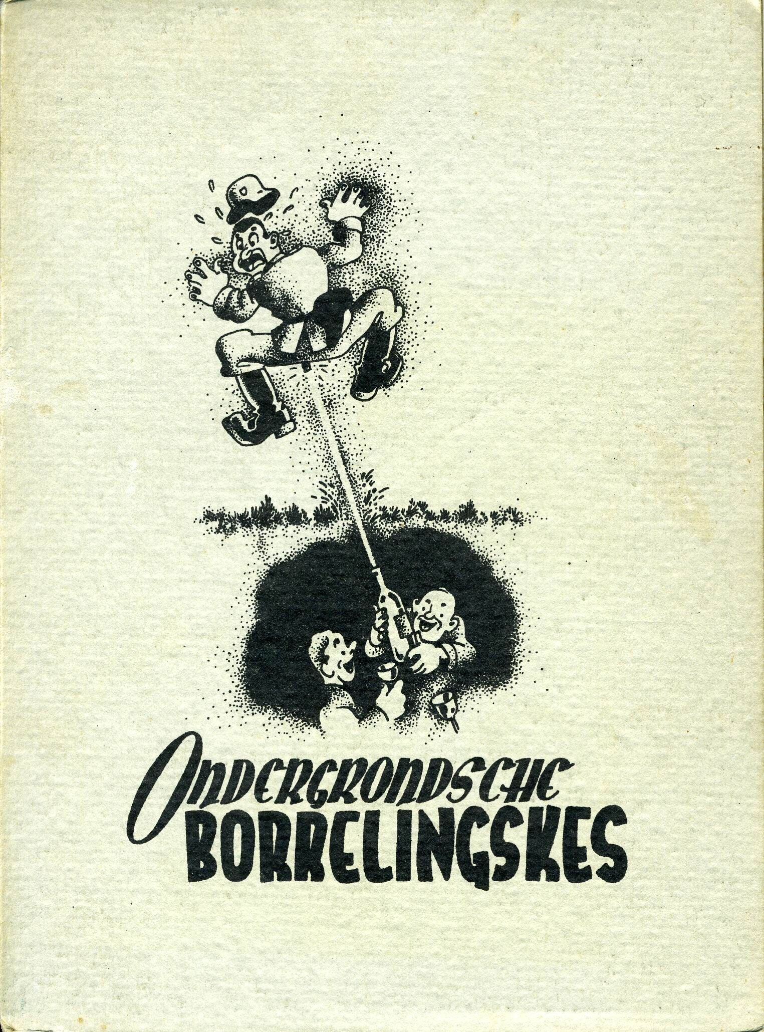 Een boekje met spotprenten over de oorlogstijd met de titel: "Ondergrondse borrelingskes" uitgegeven door: "Kraft Durch Schadenfreude N.V. 1945".
