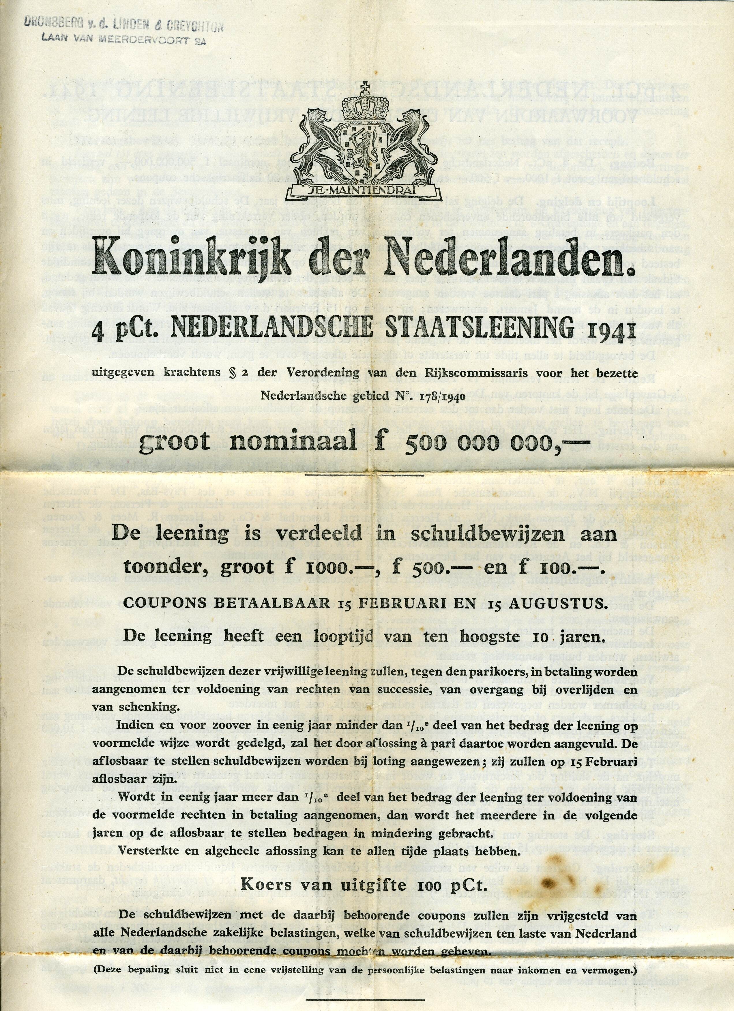 Een gedrukte aankondiging van een staatslening met bovenaan het wapen van Nederland met de spreuk "Je maintiendrai" en daaronder: "Koninkrijk der Nederlanden 4 pCt. Nederlandsche staatsleening 1941 uitgegeven krachtens paragraaf 2 der Verordening van den Rijkscommissaris voor het bezette Nederlandsche gebied No. 178/1940 groot nominaal f 500 000 000,-" gevolgd door de voorwaarden, gedateerd: 's-Gravenhage, 20 januari 1941.