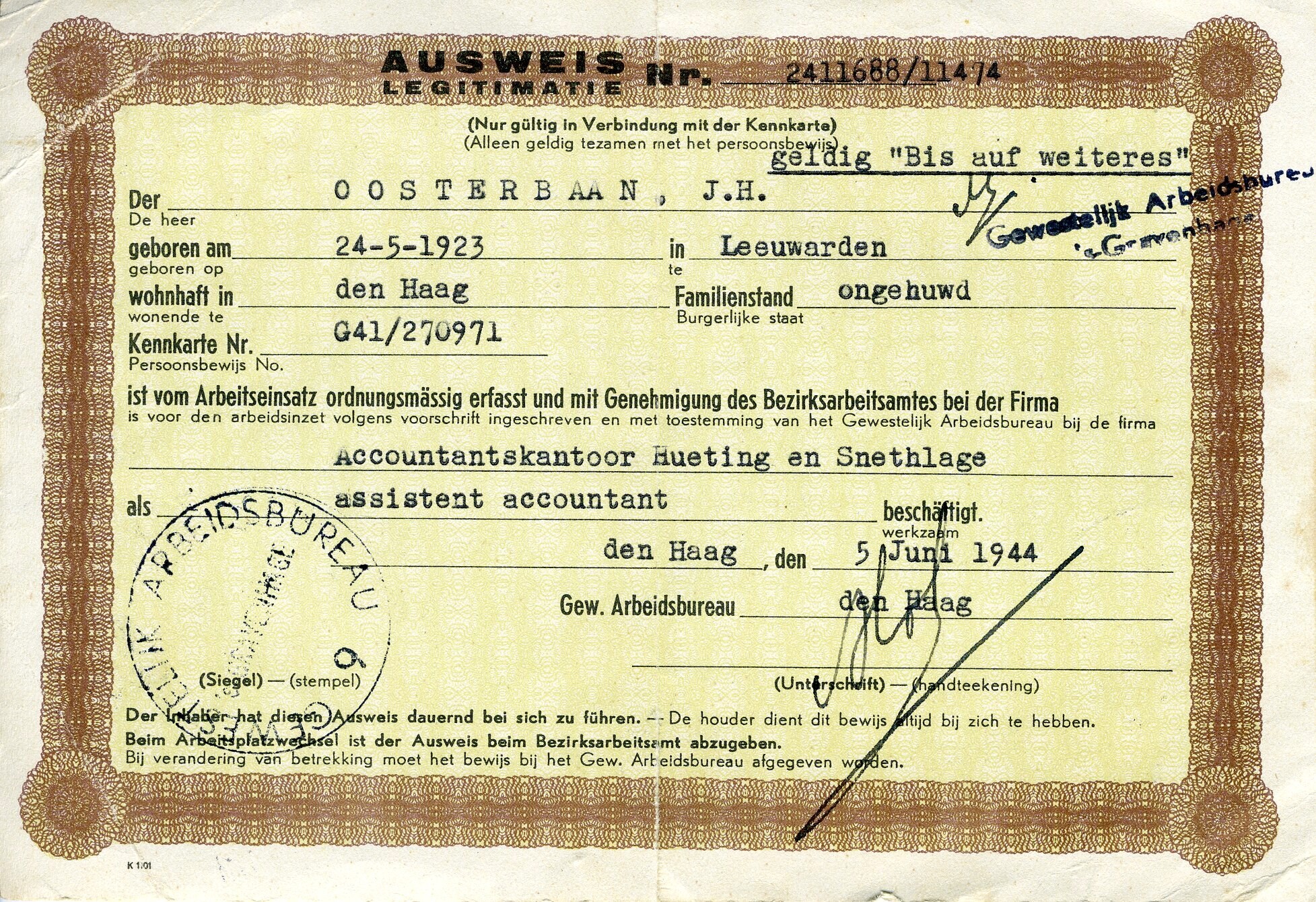 Een legitimatiebewijs afgegeven door het Gewestelijk Arbeidsbureau te Den Haag met datum 5 juni 1944 op naam van J.H. Oosterbaan geboren op 24 mei 1923 te Leeuwarden, wonende te Den Haag en werkzaam bij het accountantskantoor Hueting en Snethlage als assistent accountant.