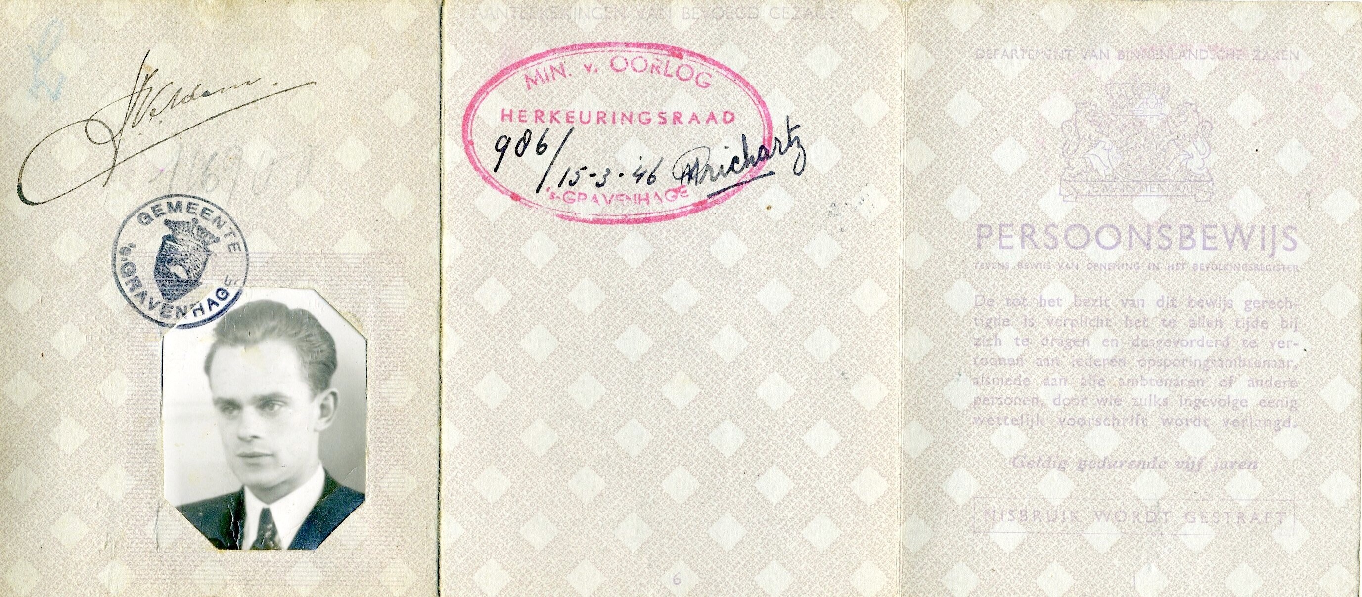 Een persoonsbewijs uitgegeven op 19 mei 1941 te Den Haag op naam van Johannes Wilhelmus Adam geboren op 10 december 1945 te Den Haag met zijn pasfoto en vingerafdruk.
