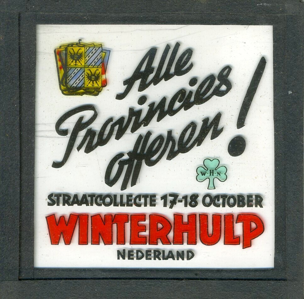 Een ingekleurd lantaarnplaatje met een zwart papieren rand. Op het plaatje zijn verschillende wapenschilden afgebeeld. Ze liggen achter elkaar, waarbij alleen de voorste echt zichtbaar is. Verder de tekst: "Alle Provincies offeren! Straatcollecte 17-18 october Winterhulp Nederland".