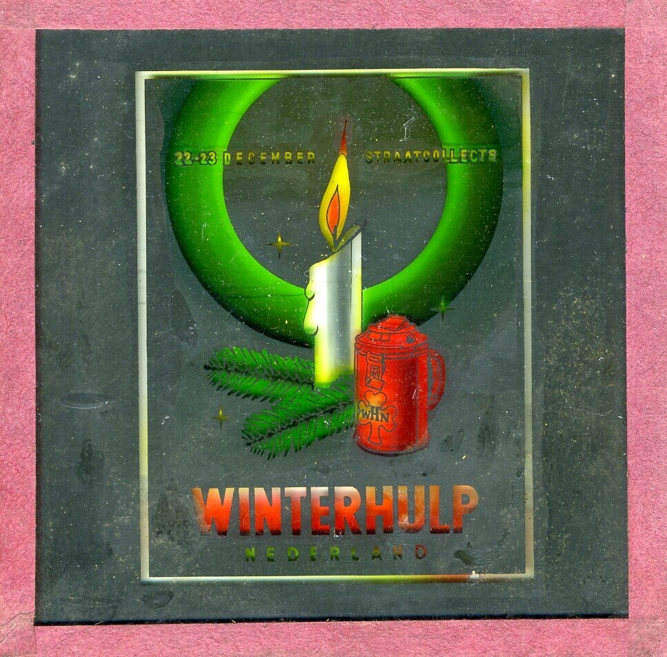 Twee uitvoeringen van een ingekleurd lantaarnplaatje met eenzelfde afbeelding. Een plaatje heeft een zwart papieren rand, de andere een paars papieren rand. Op beide plaatjes is een brandende kaars met een dennentak en een collectebus afgebeeld met de tekst: "22-23 december straatcollecte Winterhulp Nederland".