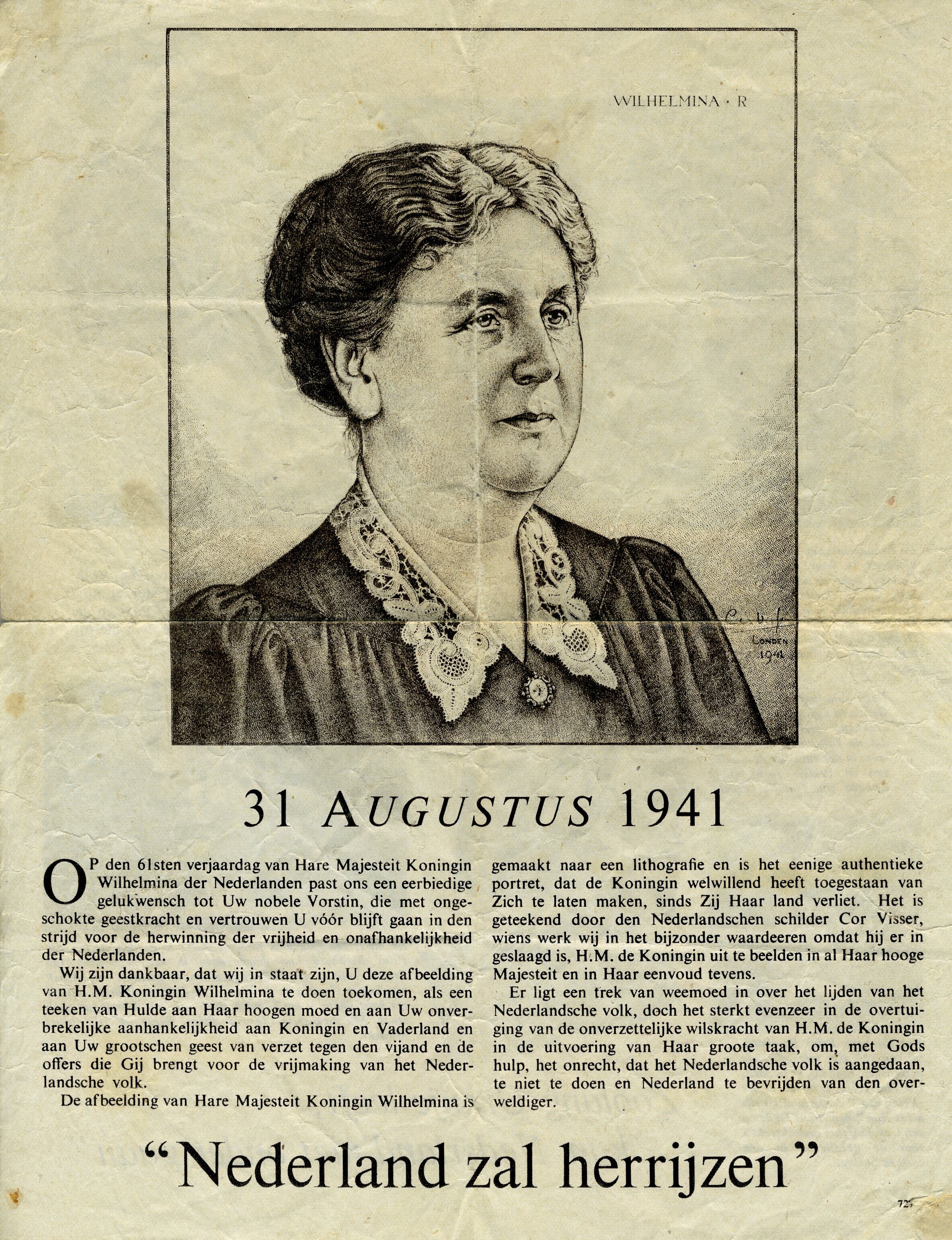 Een gedrukt pamflet met op de voorkant een getekend portret van Koningin Wilhelmina gedateerd: "Londen 1941". Hieronder: "31 Augustus 1941" de datum van haar 61ste verjaardag met daaronder een begeleidende tekst afsluitend met: "Nederland zal herrijzen". Op de andere kant zijn foto's afgedrukt van het prinselijk gezin met begeleidende teksten en de zin: "Zoolang Oranje leeft, kan Nederland niet onder gaan".