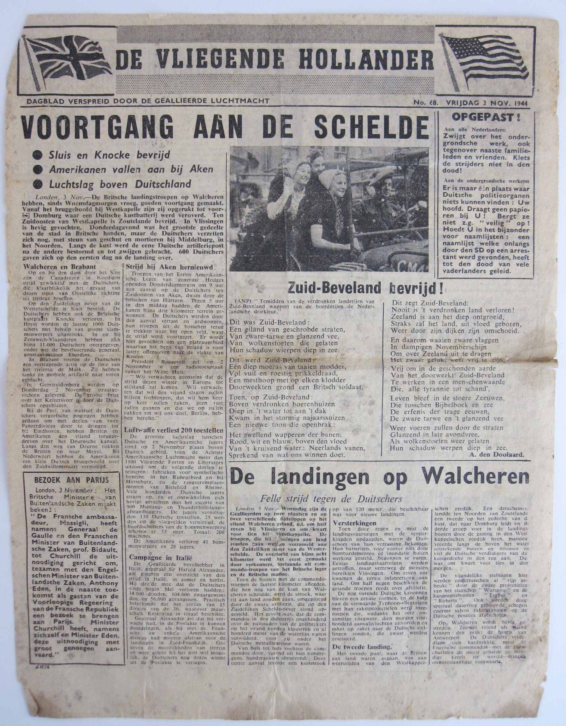 Twee uitgaven van het krantje "De Vliegende Hollander. Dagblad verspreid door de geallieerde luchtmacht": vrijdag 3 november 1944 met als hoofdartikel: "Voortgang aan de Schelde" en maandag 26 februari 1945 met als hoofdartikel: "Geallieerd offensief over de Roer".
