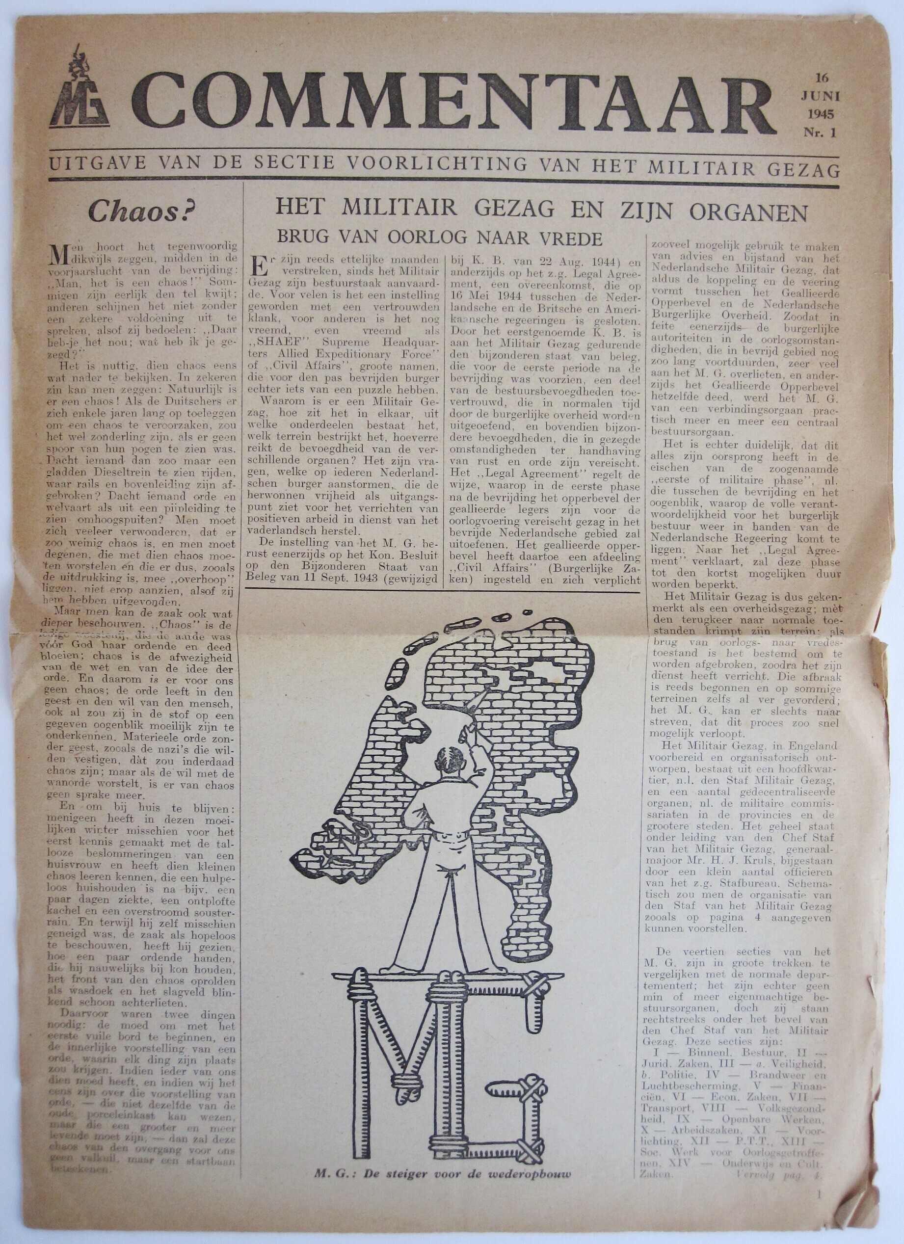 Het eerste nummer van het weekblad "Commentaar" op 16 juni 1945: "Uitgave van de Sectie Voorlichting van het Militair Gezag". Tevens een brief "Aan H.H. Boekhandelaren" waarin gevraagd wordt het weekblad "Commentaar" te verkopen.