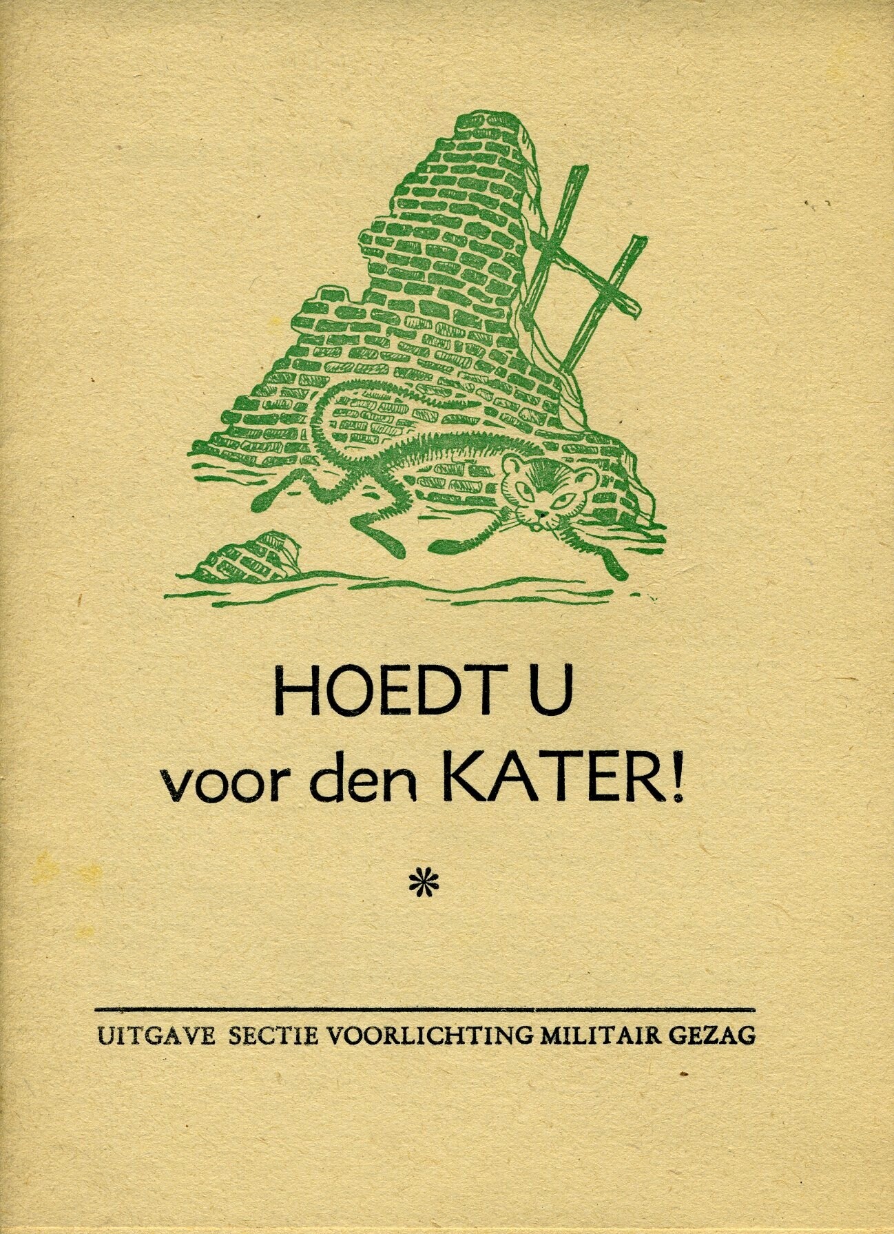 Een gedrukte boek met op de voorkant in groene opdruk een kat voor een ruïne. Hieronder staat: "Hoedt U voor den Kater! Uitgave Sectie Voorlichting Militair Gezag".
