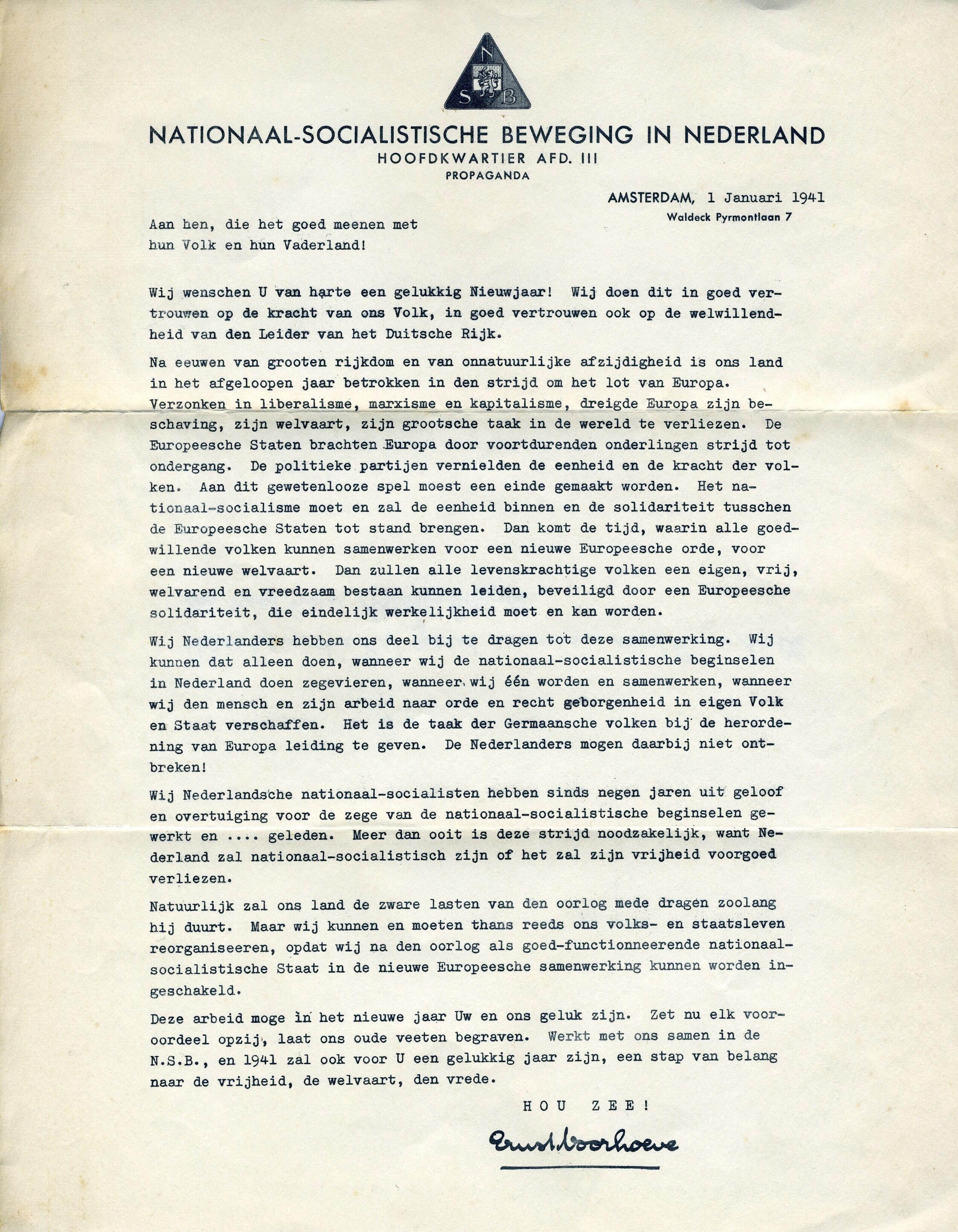 Een gedrukte brief van de "Nationaal-Socialistisch Beweging in Nederland" met een nieuwjaarswens voor 1941.