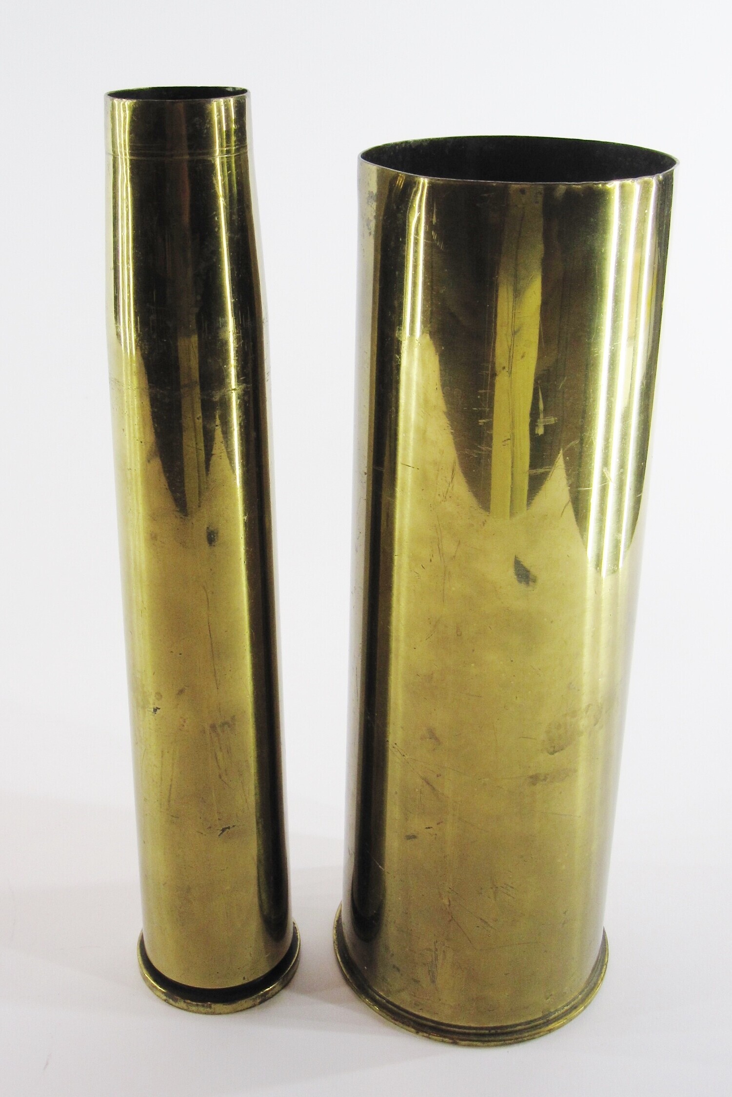 Twee granaathulzen van verschillende grootte verzameld in de omgeving Nijmegen. Op de huls met de grootste diameter, de 25-ponder, staat het jaartal 1944, op de andere, 40 mm granaat, het jaartal 1942.