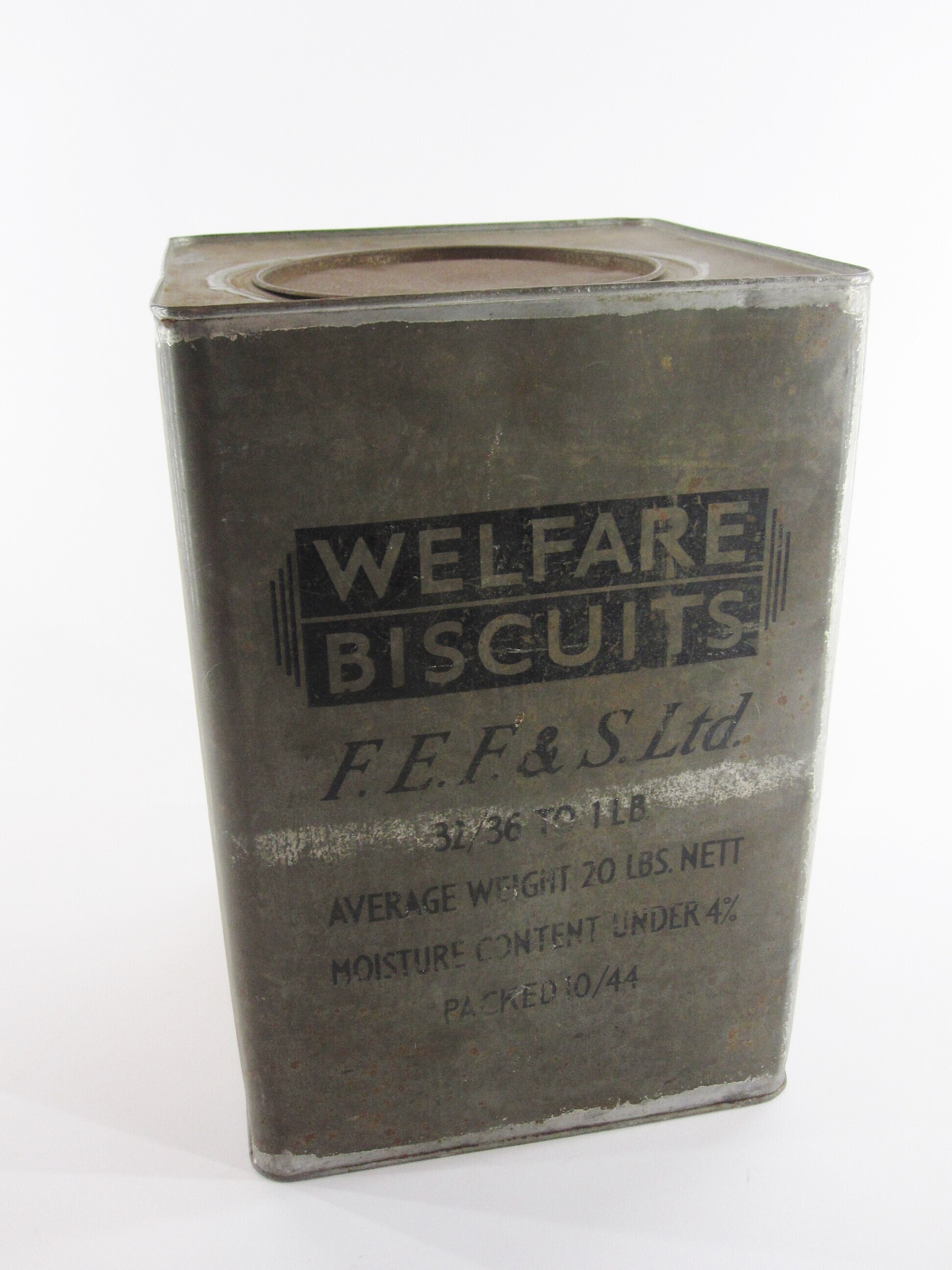 Een leeg rechthoekige metalen blik met rond deksel. Op het blik staat: "Welfare Biscuits. F.E.F. & S. Ltd. 31/36 to 1LB. Average Weight 20 Lbs. Nett. Moisture Content Under 4%. Packed 10/44". Het blik is afkomstig van een voedseldropping.