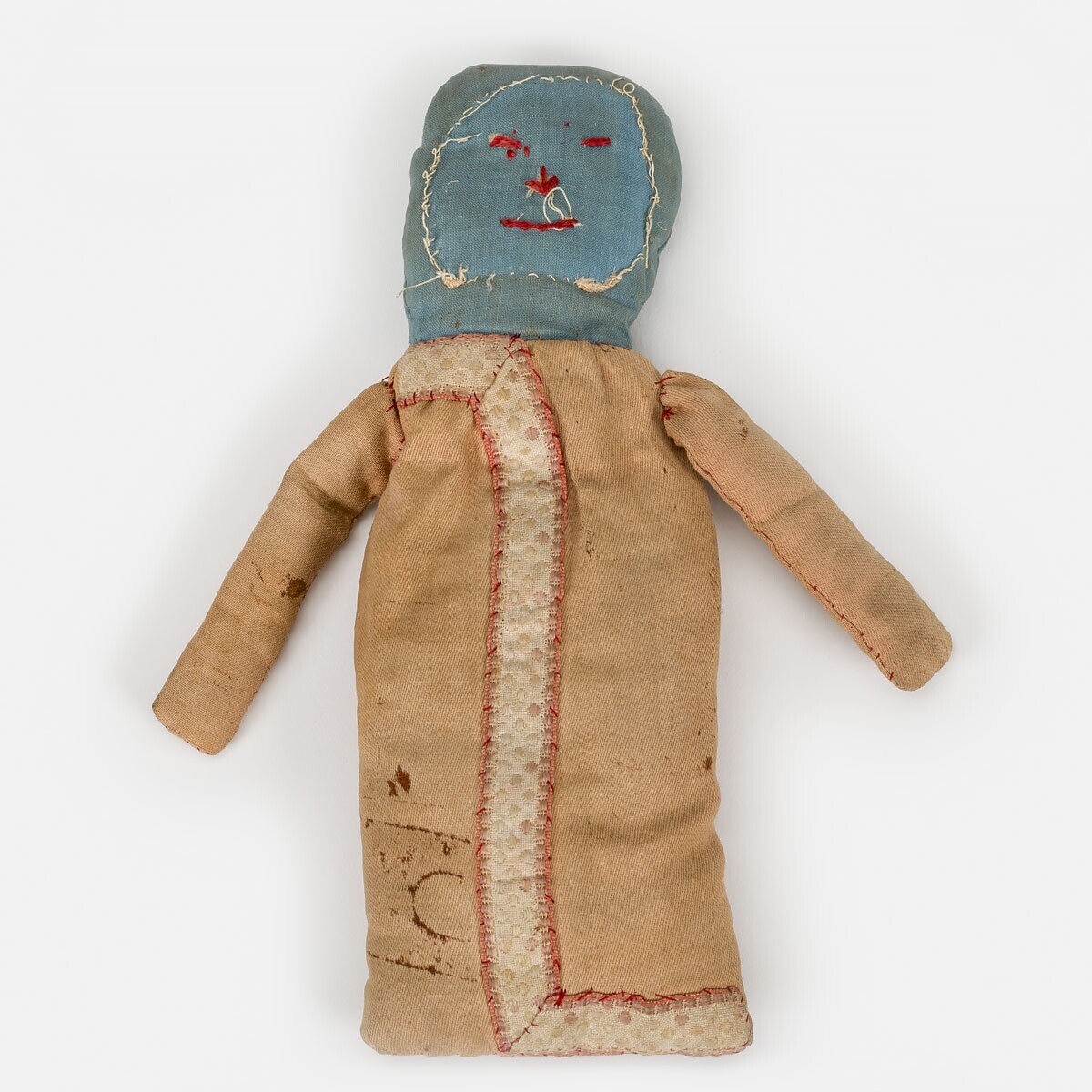 Een pop met een blauw gezichtje, waar vroeger waarschijnlijk een wit lapje als gezichtje heeft gezet...