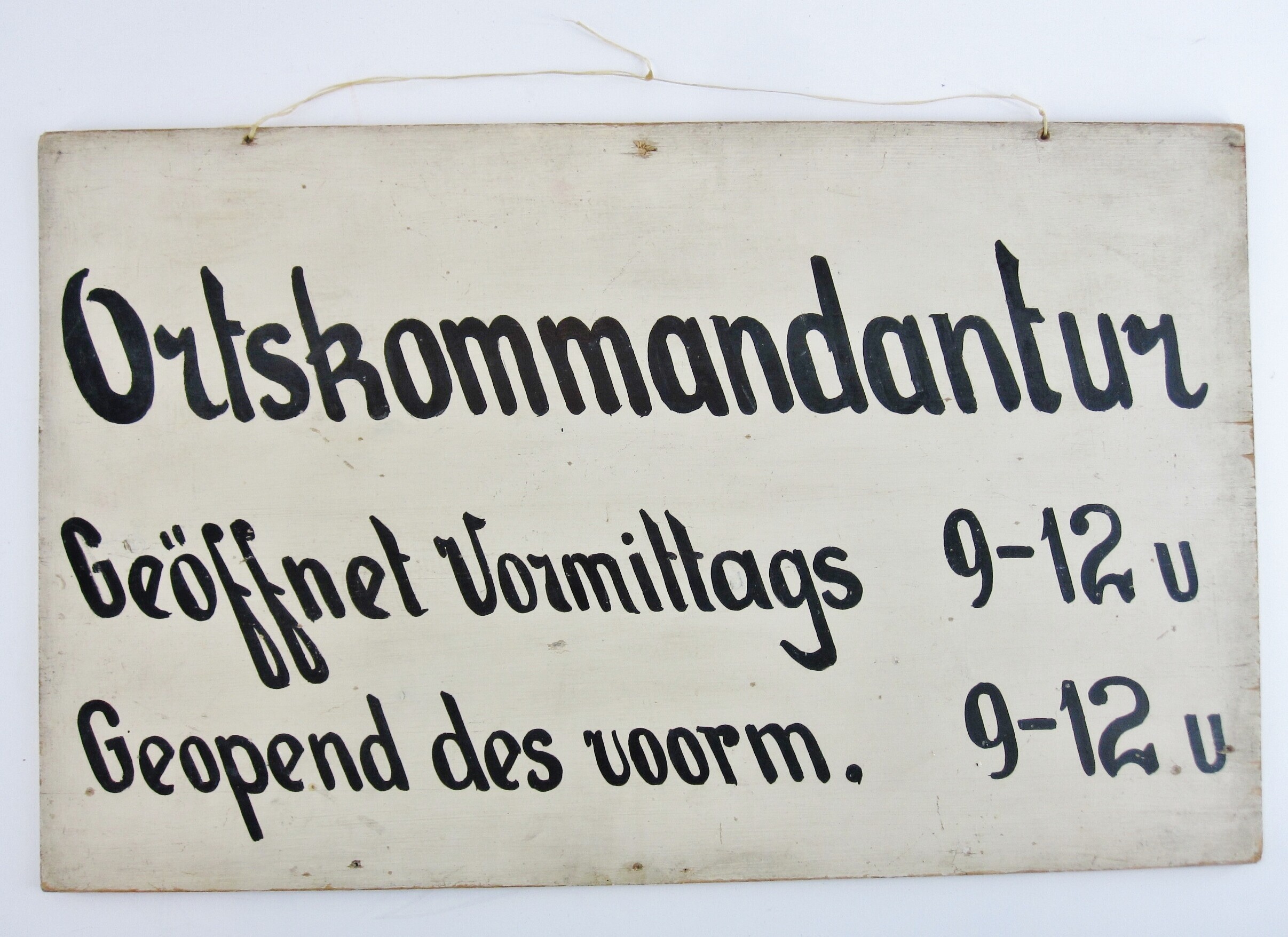 Een houten wit geverfd mededelingenbord met op een kant met zwarte letters: "Ortskommandantur Geöffnet Vormittags 9-12 u Geopend des voorm. 9-12 u". Op de andere kant met rode letters: "Zum Div. Stab ABT.Ia u. II a".