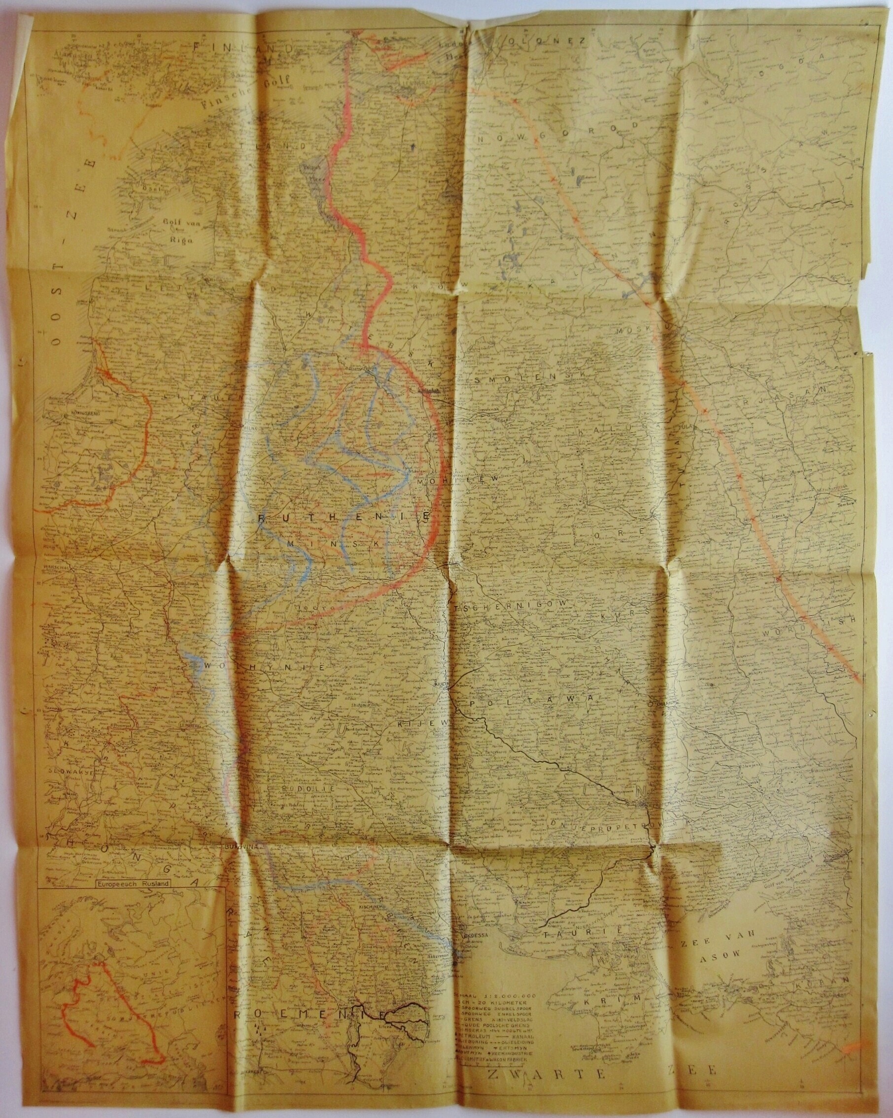 Een gedrukt kaart van "Europeesch Rusland" waarop de ontwikkelingen aan het Oostfront zijn bijgehouden in rood en blauw potlood.