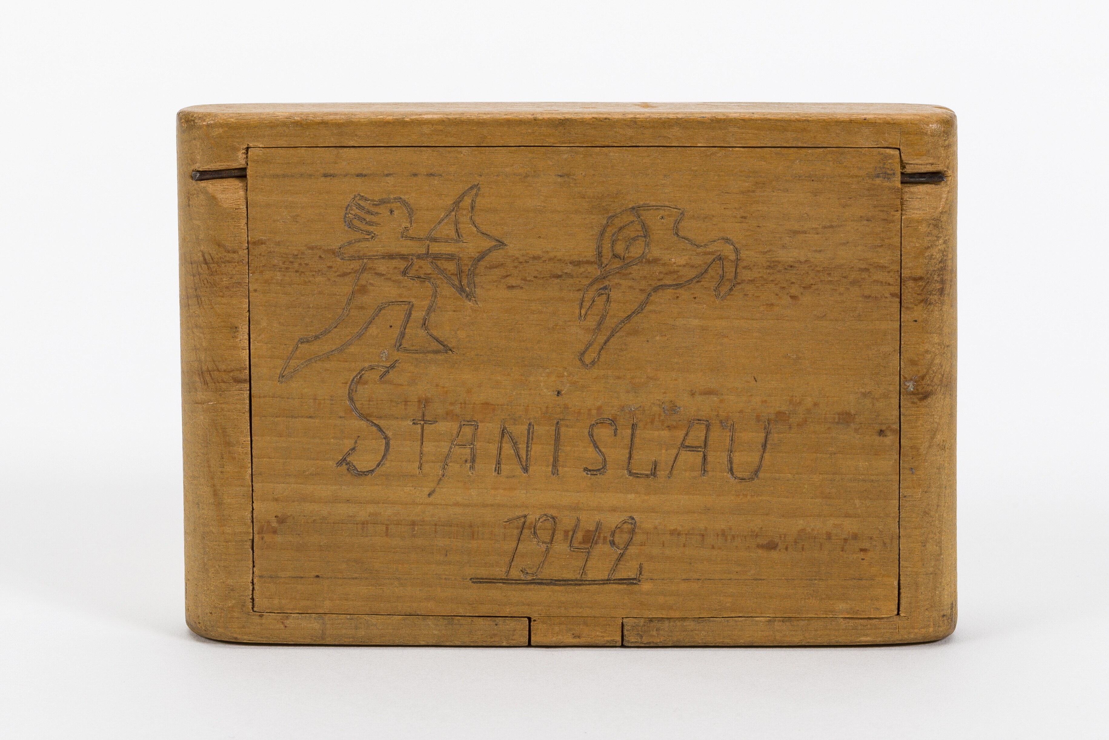 Een uit hout gesneden sigarettendoos. Op het deksel zijn twee sterrenbeelden gesneden: Boogschutter en Ram. Hieronder: "Stanislau 1942". Het doosje is vervaardigd in het krijgsgevangenkamp Stalag 371 te Stanislau. In het kamp werden Nederlandse cadetten en adelborsten onder gebracht.