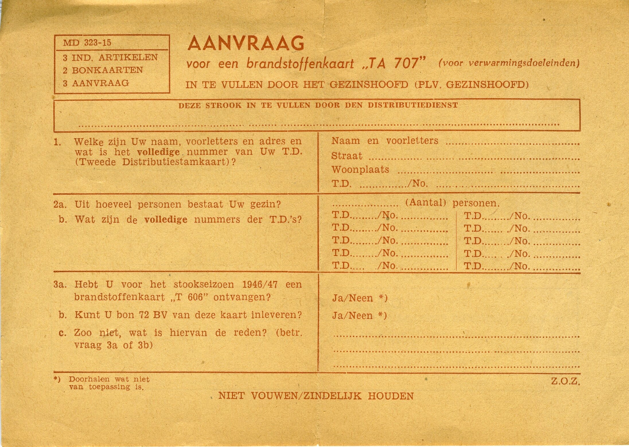 Een aan beide zijden voorgedrukt oningevuld formulier voor de "Aanvraag voor een brandstoffenkaart "TA 707" (voor verwarmingsdoeleinden) in te vullen door het gezinshoofd (plv. gezinshoofd)".