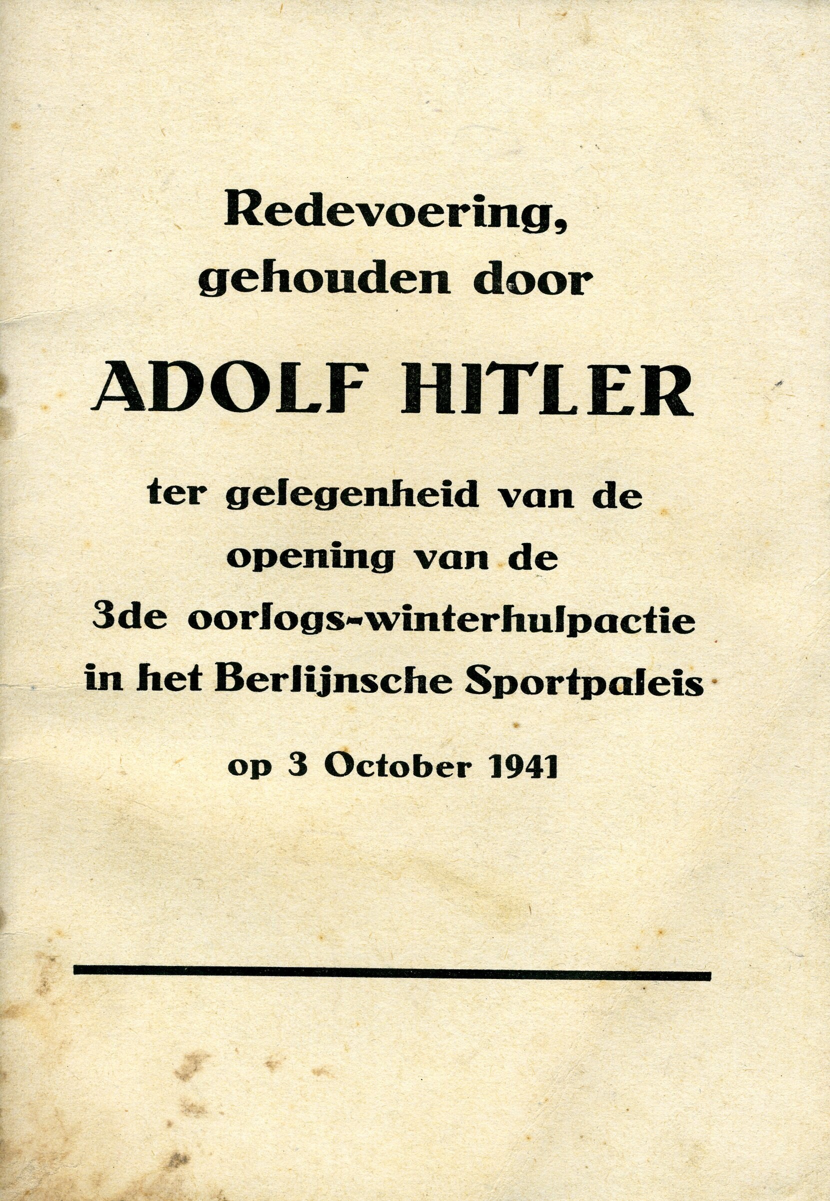 Een 24 bladzijden tellende gedrukte boek met de "Redevoering, gehouden door Adolf Hitler ter gelegenheid van de opening van de 3de oorlogs-winterhulpactie in het Berlijnsche Sportpaleis op 3 October 1941".