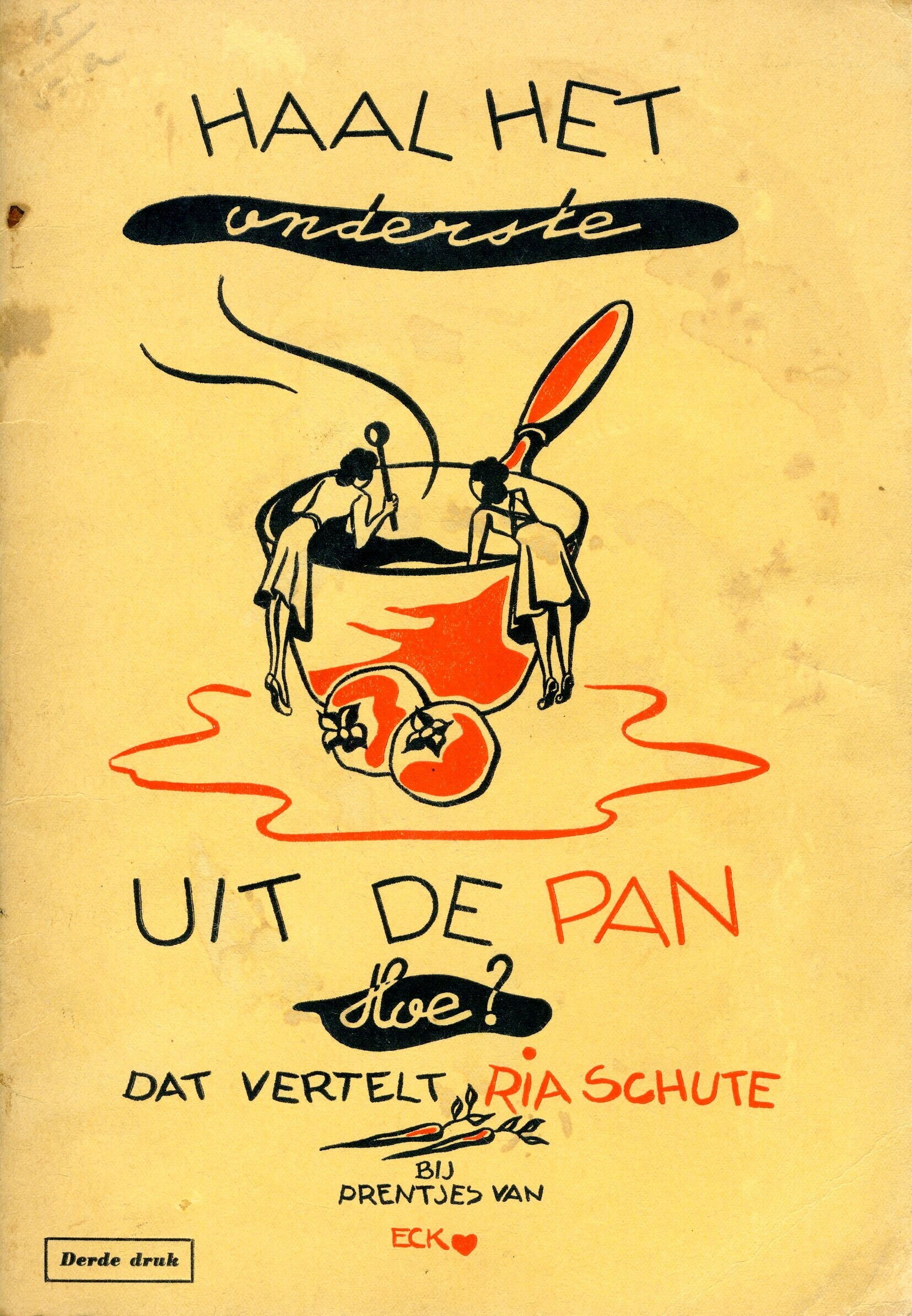 Een gedrukt geïllustreerd boekje met licht gele kaft met een afbeelding van twee vrouwen die bij een enorme dampende pan staan. Op de titelpagina staat: "Haal het onderste uit de pan. Door Ria Schute Kooklerares bij het Gemeentelijk Gasbedrijf te 's-Gravenhage. Ontwerp en typografische verzorging van L. Eckhardt. (Derde druk) Uitgave van: Drukkerij en uitgeverij Korthuis, Marnixstraat 6, Den Haag".