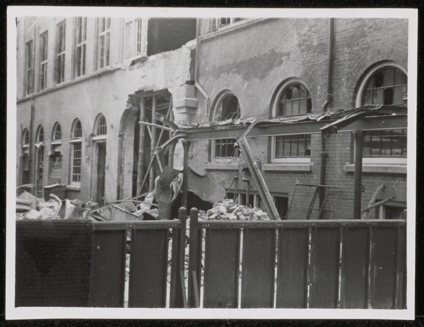 Acht zwart-wit foto's van de gevolgen van het bombardement door de Royal Air Force op het gebouw van de Plaatselijke Telefoondienst (PTD) aan de Marnixstraat te Den Haag op 4 mei 1943. Twee foto's zijn afgegeven door 'Foto v. Puffelen' te Den Haag. Daarbij een enveloppe gericht aan J.F.J. Koreman waarop staat: "Gratificatie in verband met de bijzondere dienstprestatie na den bominslag op 4 Mei 1943, gecombineerd met het feit dat de Telefoondienst te 's-Gravenhage op 1 Juli 1943 40 jaar bestond."