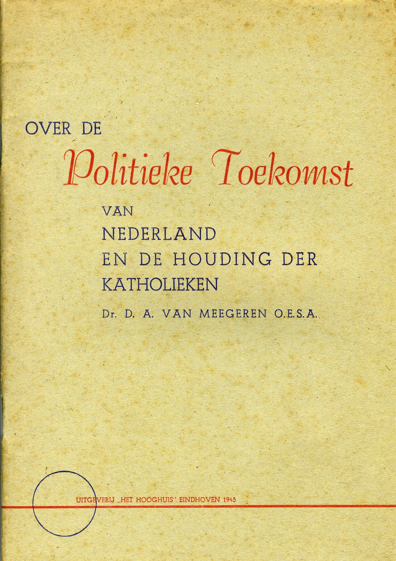 Een boek met op de grijze kaft met blauwe en rode opdrukt: "Over de Politieke Toekomst van Nederland en de houding der Katholieken. Dr. D.A. van Meegeren O.E.S.A. Uitgeverij "Het Hooghuis" Eindhoven 1945" met een inleiding gedateerd: "Nijmegen, 30-1-'45".