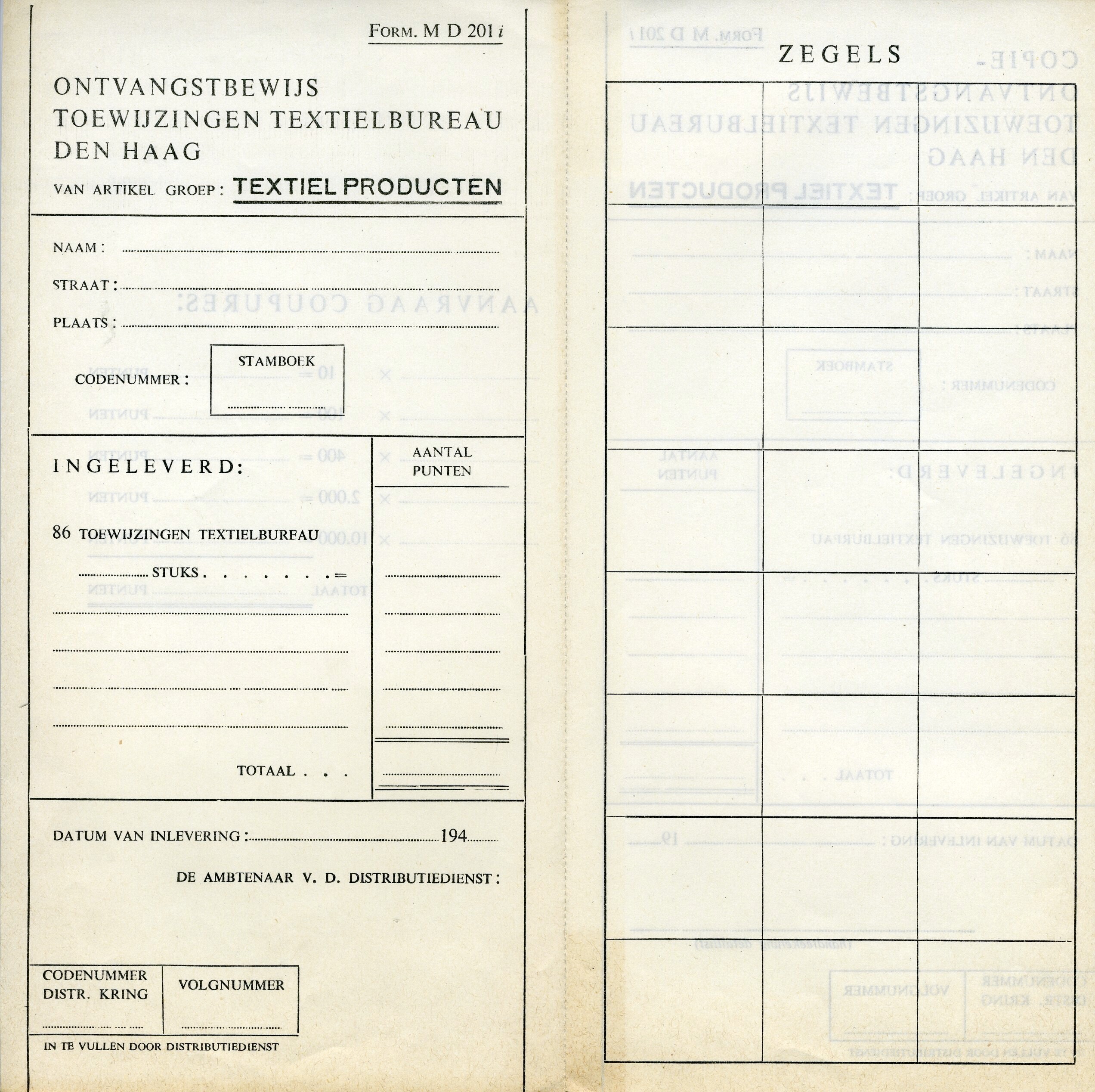 Twee blanco ontvangstbewijzen voor textielproducten. Het betreft formulier MD 201h: ''ontvangstbewijs textielpunten'' en formulier MD 201i ''ontvangstbewijs toewijzing textielbureau Den Haag''. De formulieren zijn uitvouwbaar.
