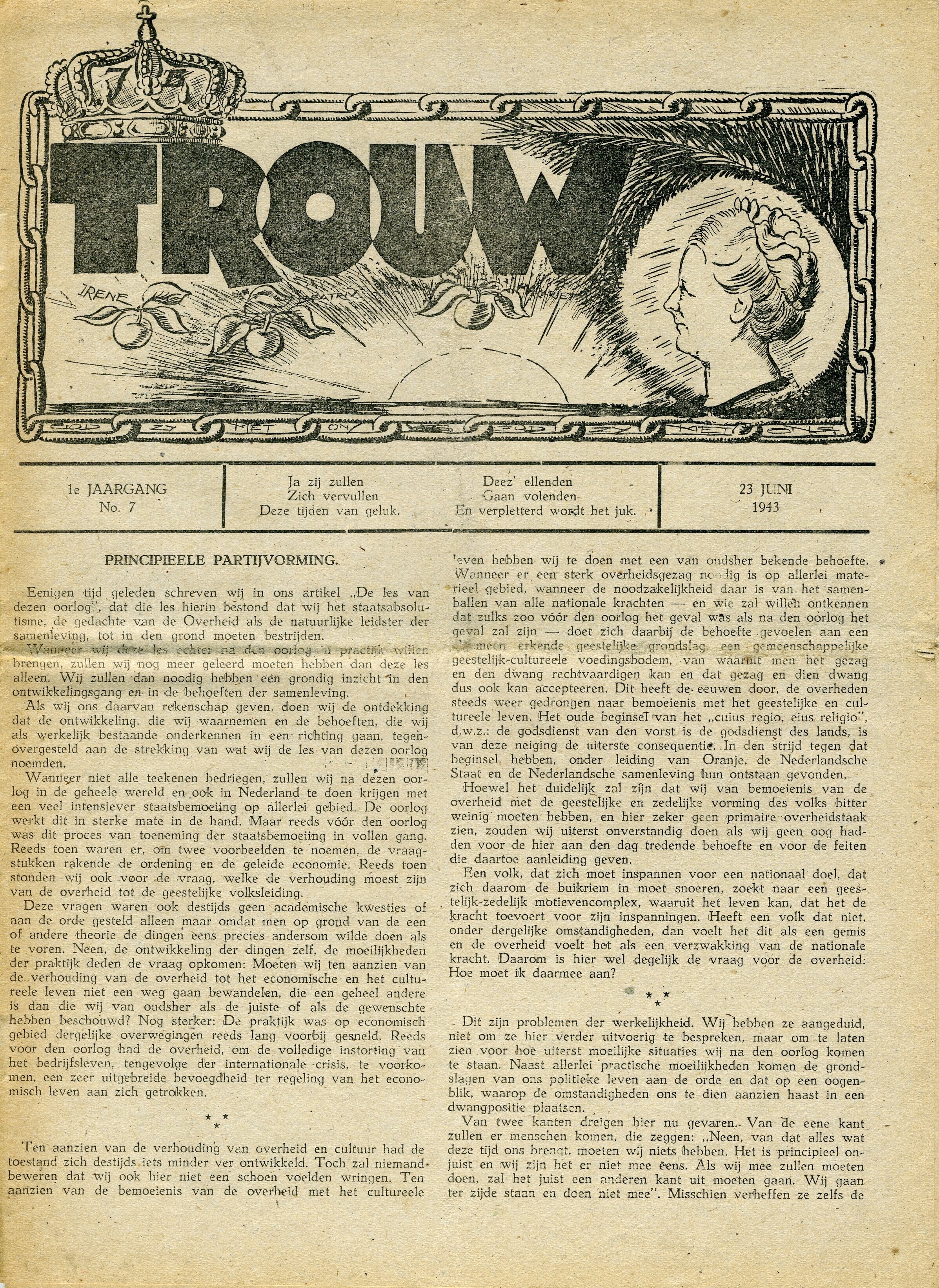 Twaalf exemplaren van ''Trouw''. Het betreft de eerste jaargang (1943) de nummers 7, 8, 11, 12, 13, 14 en 15. Van de tweede jaargang (1944) de nummers 4, 5, 6, 7 en 15. De edities zijn meerbladig en verschillend van afmeting en uitvoering.