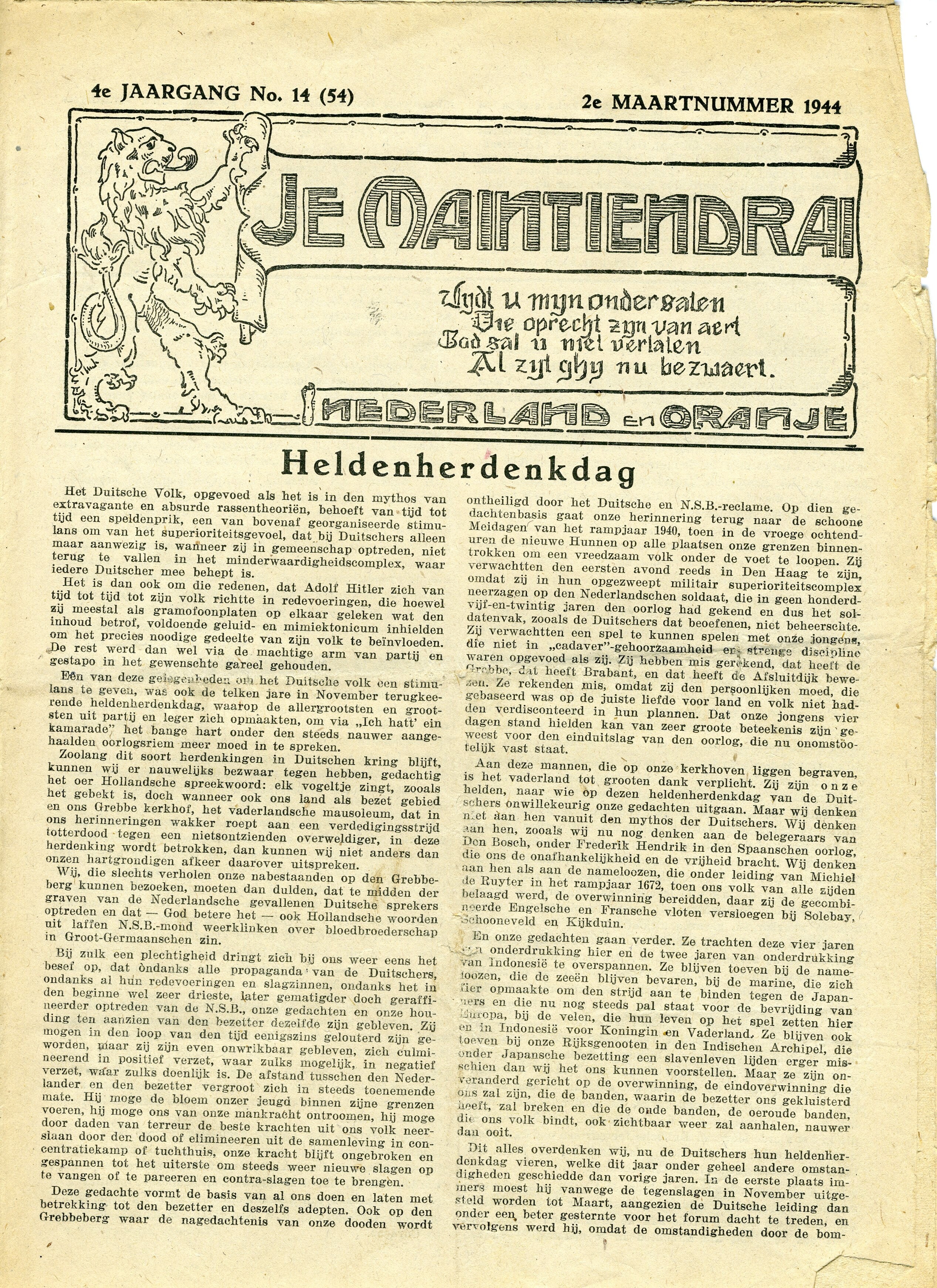 Editie van de verzetskrant ''Je Maintiendrai". Het betreft nummer 14 van de vierde jaargang van maart 1944. De editie omvat vier pagina's en is onder andere gewijd aan Heldenherdenkdag.