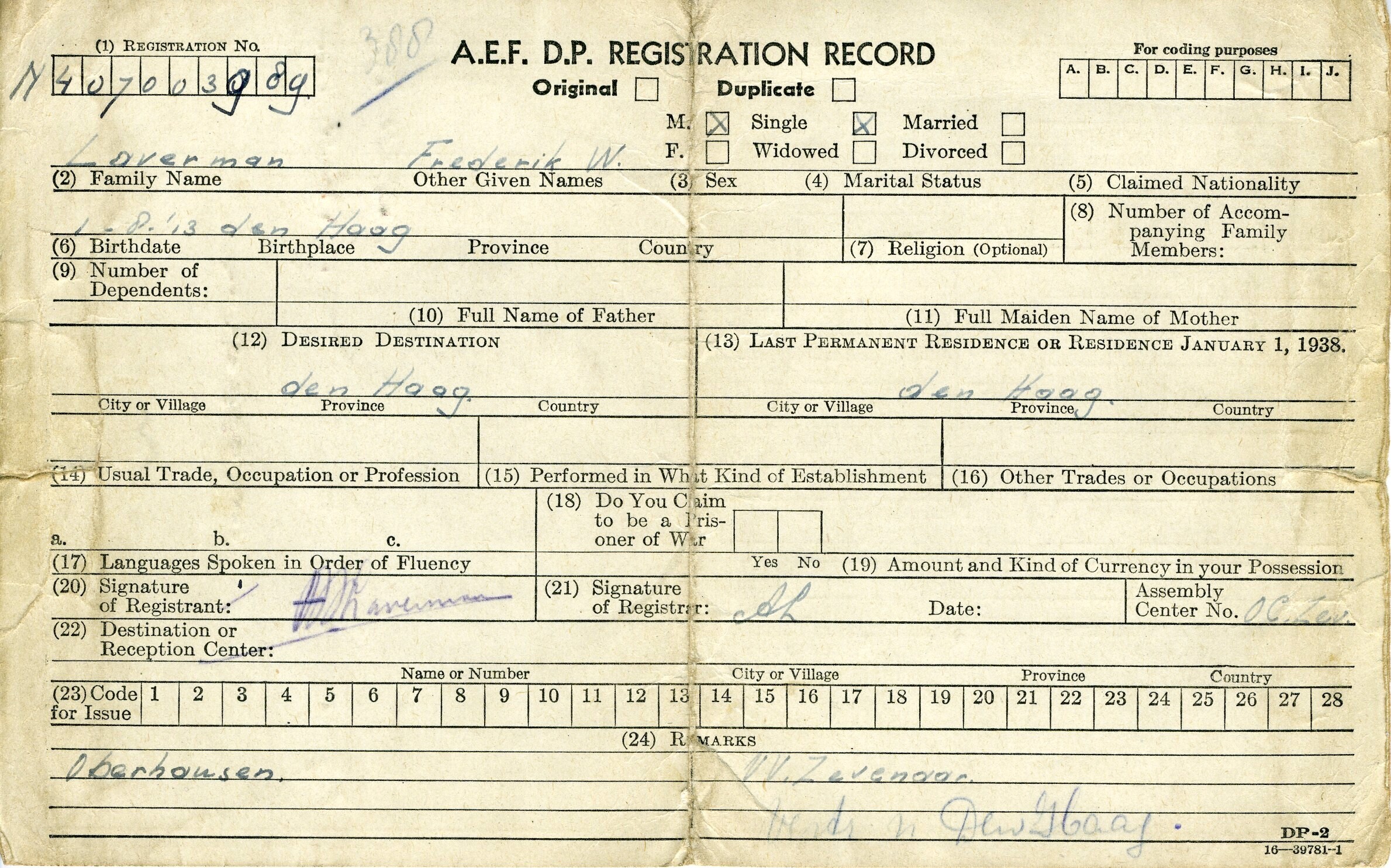 Een "A.E.F. D.P. Registration Record" gedrukt in het Engels, ingevuld met pen in het Nederlands. De kaart is op naam gesteld van "Frederik W. Loverman" geboren op 1 augustus 1913 te Den Haag. Onderaan staat bij "Assembly Center No.: O.C. Zev." en: "Oberhausen V.V. Zevenaar vertr. n. Den Haag". Op de achterkant een rood stempel van Het "Militair Gezag Dienst der Reptrieering Vak IV A Districtshoofd Arnhem" en o.a. de aantekeningen: "Ned. Pers. Houder van deze D.P. Kaart is gerechtigd ongehinderd de IJssel te passeren", "No Lice" en de dagtekening: "Zevenaar 23-5-'45".