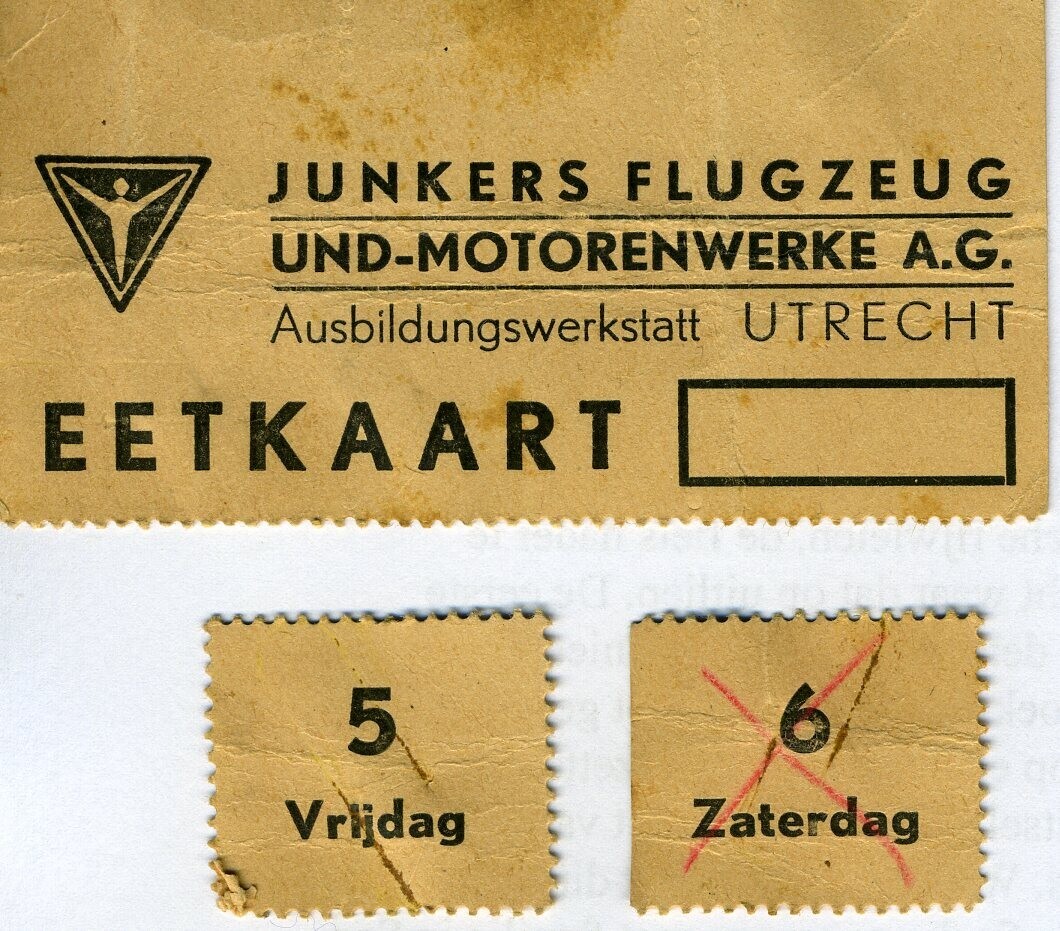 Eetkaart van de Junkers Flugzeug und Motorenwerke A.G. in Utrecht met twee losse afgescheurde coupons van de vrijdag en zaterdag.