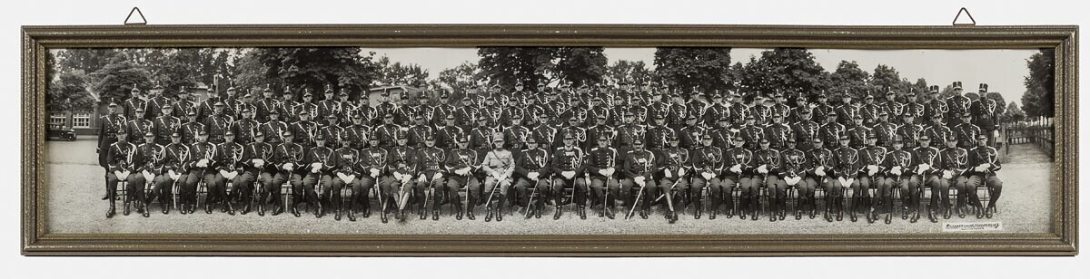 Een ingelijste groepsfoto van leden van de Koninklijke marechaussee waaronder de heer B. Uiterwijk. Rechtsonder: "N.V. Vereenigde fotobureaux Amsterdam-C. tel. 40856-33244. Singel 93 Rouline-foto's".