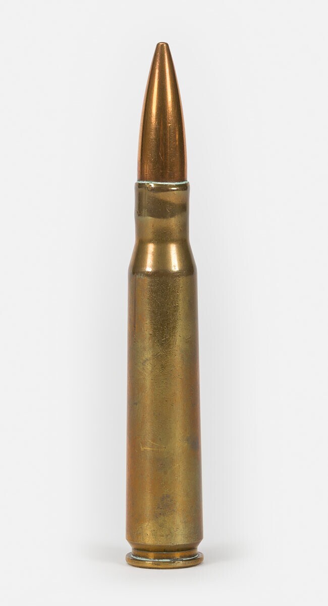 Een kogel van 50 kaliber met messing huls en koperen punt. Onderaan: "KS 43" staat voor: Kelly Springfield, Allegany Ordnance Plant te Cumberland, Maryland, Verenigde Staten.