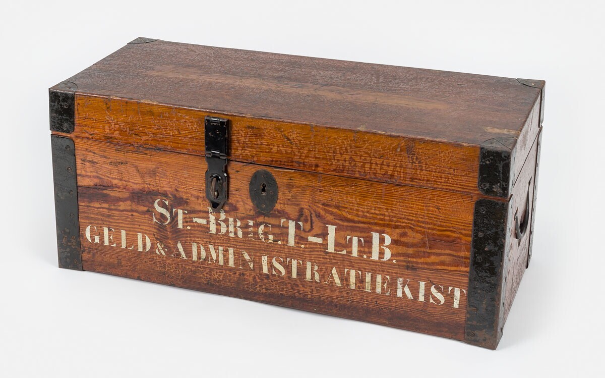 Een houten gelakte kist met zwart geverfd ijzerbeslag, twee zwartgeverfde metalen handvaten, een slot en de mogelijkheid een hangslot aan te brengen. Het openslaande deksel is verbonden met een leren band met de rest van de kist. Op de kist staat in sjabloonletters: "St.-Brig.T.-LtB. Geld & Administratiekist". In de kist is in een apart houten afsluitbaar compartiment een metalen geldkistje met sleuteltje opgeborgen.