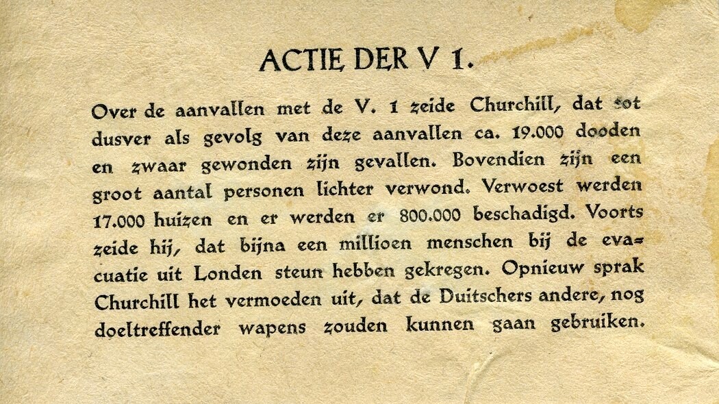 Een pro-Duits gelig pamfletje met zwart gedrukte tekst over de aanvallen op Londen door V1-raketten.