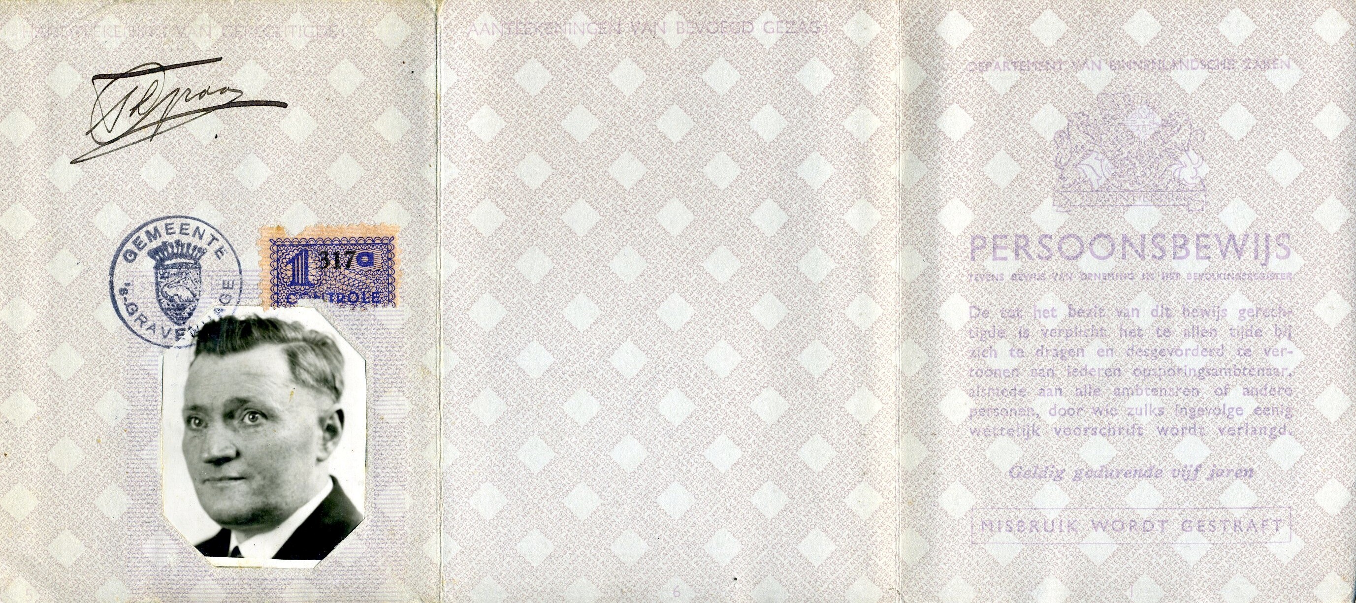 Een persoonsbewijs afgegeven te Den Haag op 10 september 1941 op naam van Theodorus Graas geboren op 14 oktober 1896 te Wormerveer (N.H.), van beroep kleermaker met zijn pasfoto en vingerafdrukken. Toegevoegd is een blaadje met daarop gedrukt de "Verplichtingen ten aanzien van het Persoonsbewijs".
