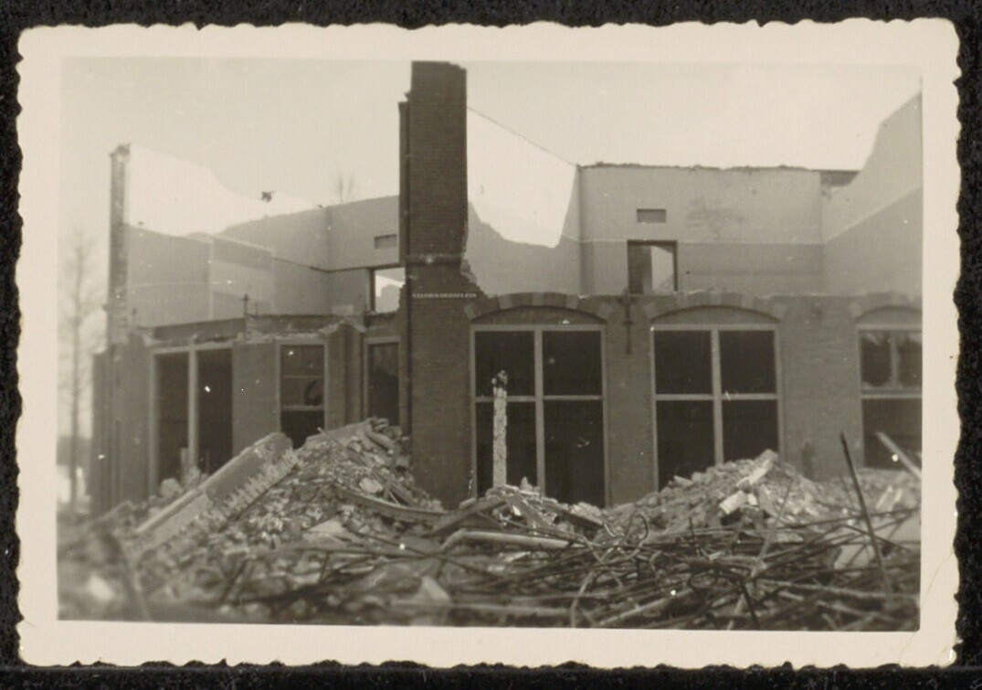 Een zwartwit foto van de afbraak voor de Atlantikwall van het Instituut Schoevers: nr. 56: 13 februari 1943 (Met potlood op de achterkant: Instituut Schoevers op het Stadhoudersplein), initialen: AvV (A. van Vliet).