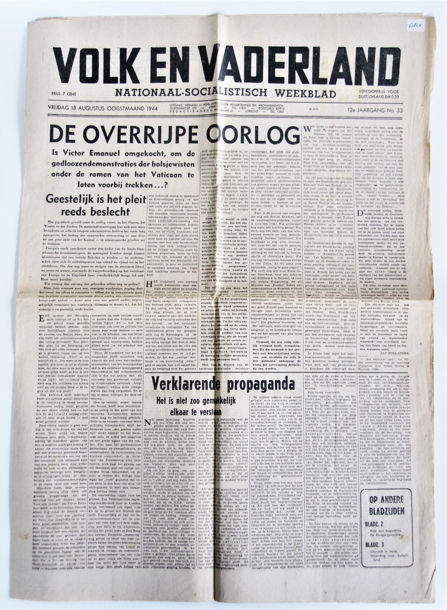 Jaargang twaalf van 'Volk en Vaderland', nationaalsocialistisch weekblad van de N.S.B. Het betreft 2 exemplaren van No. 33, vrijdag 18 augustus-oogstmaand 1944.