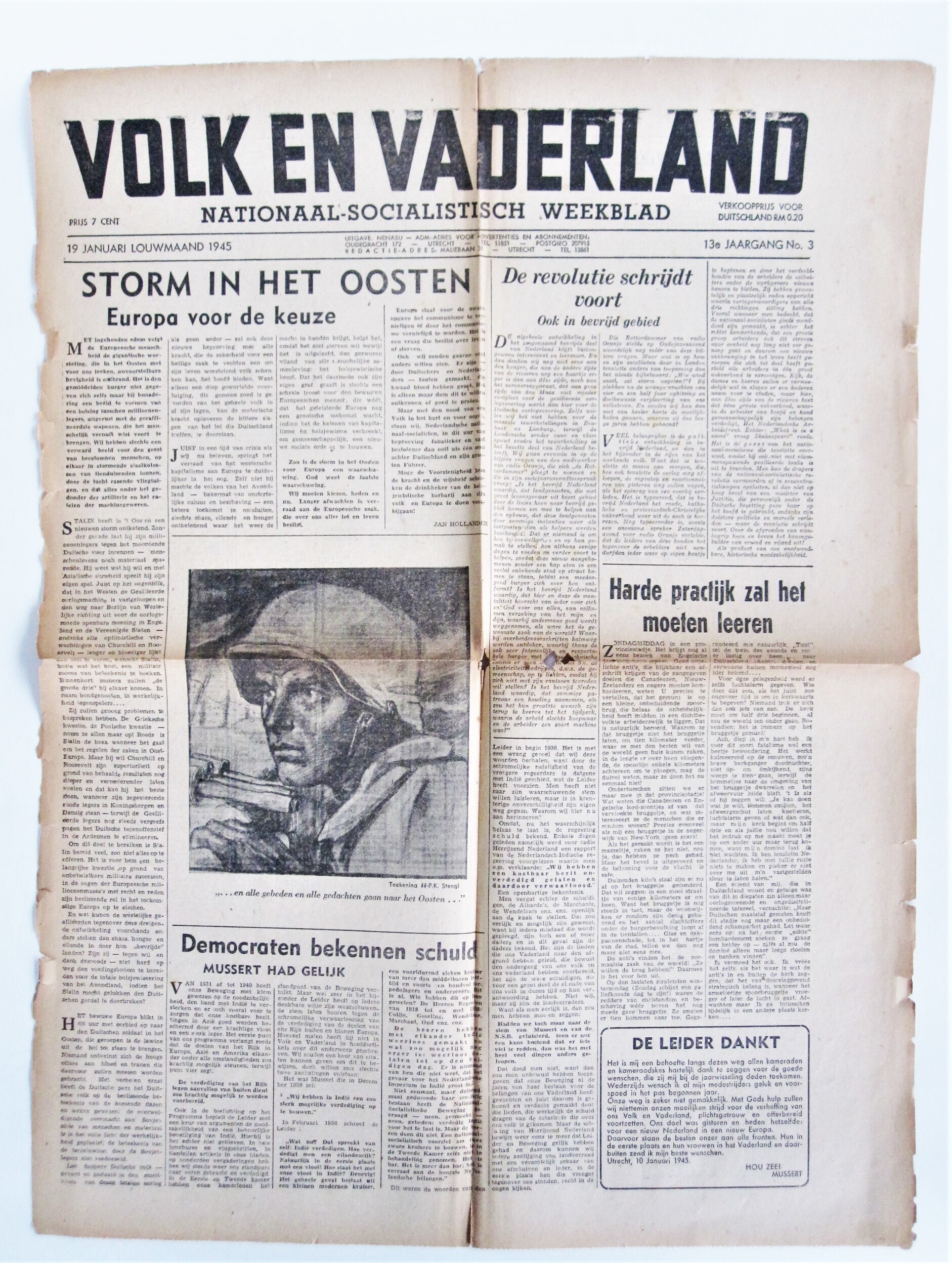 Jaargang dertien van 'Volk en Vaderland', nationaalsocialistisch weekblad van de N.S.B. Het betreft 1 exemplaar van No. 3, 19 januari-louwmaand 1945.