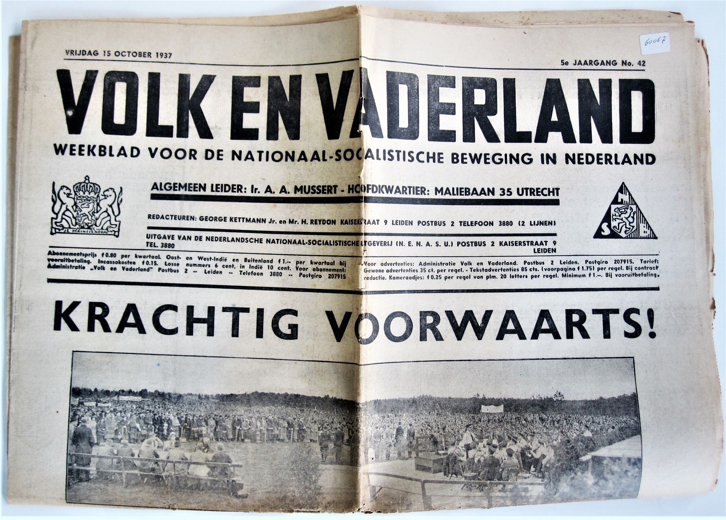 Editie van 'Volk en Vaderland', nationaalsocialistisch weekblad van de N.S.B. Het betreft nummer 42 van jaargang 5 van 15 oktober 1937