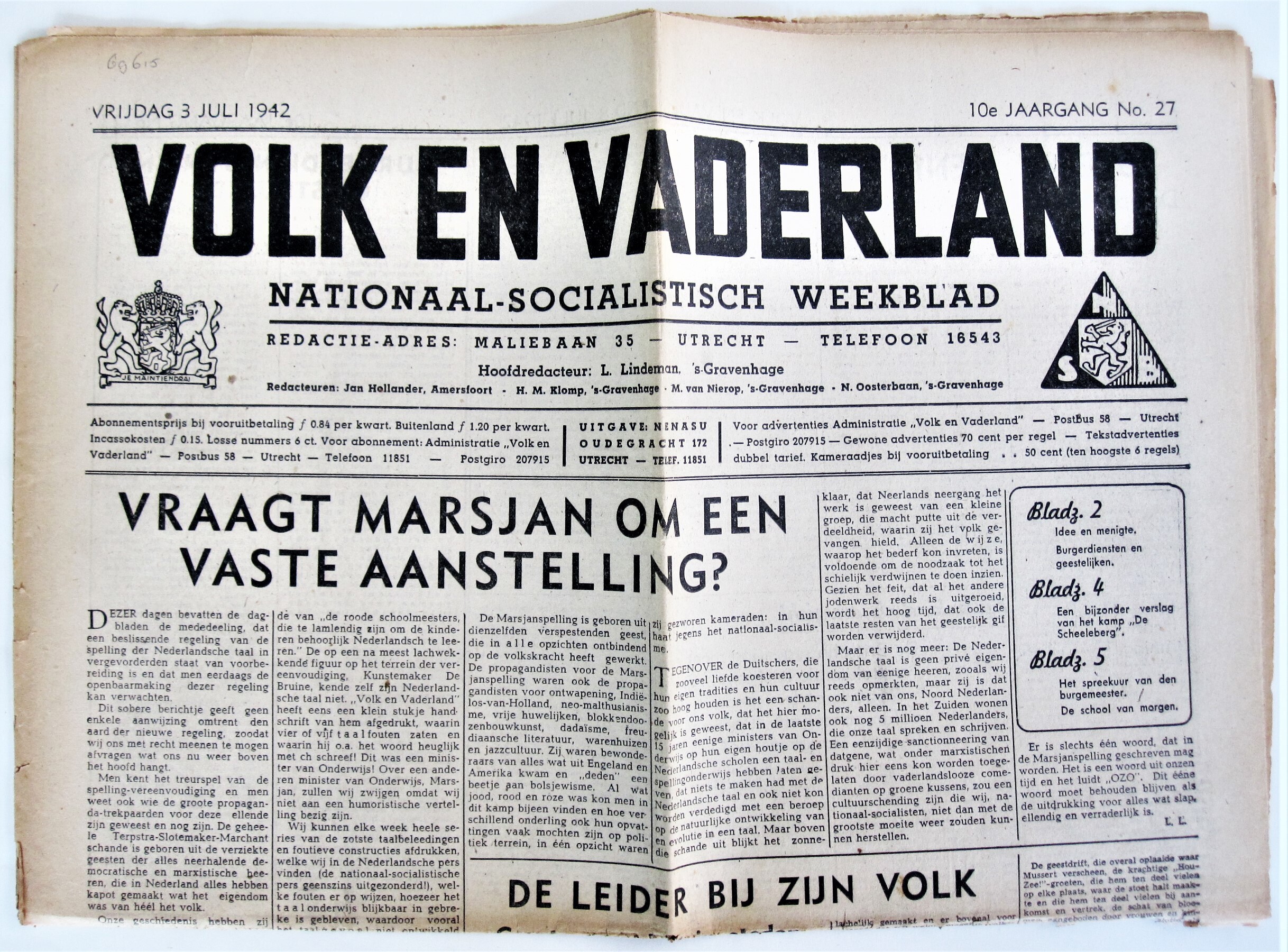 Editie van 'Volk en Vaderland', nationaalsocialistisch weekblad van de N.S.B. Het betreft nummer 27 van jaargang 10 van 3 juli 1942.
