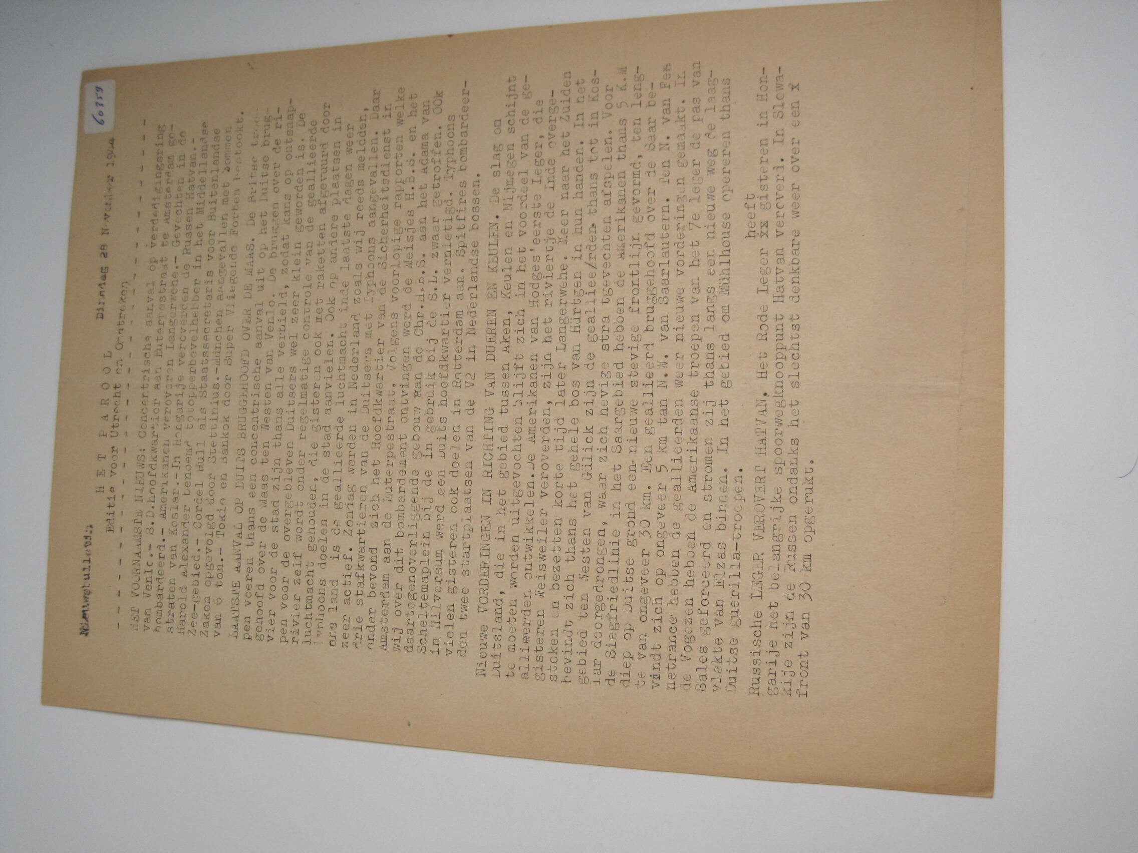 Op inschrijfkaart:<br>Illegaal blad "Het Parool".<br>Editie voor Utrecht en Omstreken.<br>Nieuwsbulletin 28 november 1944.<br><br><br>