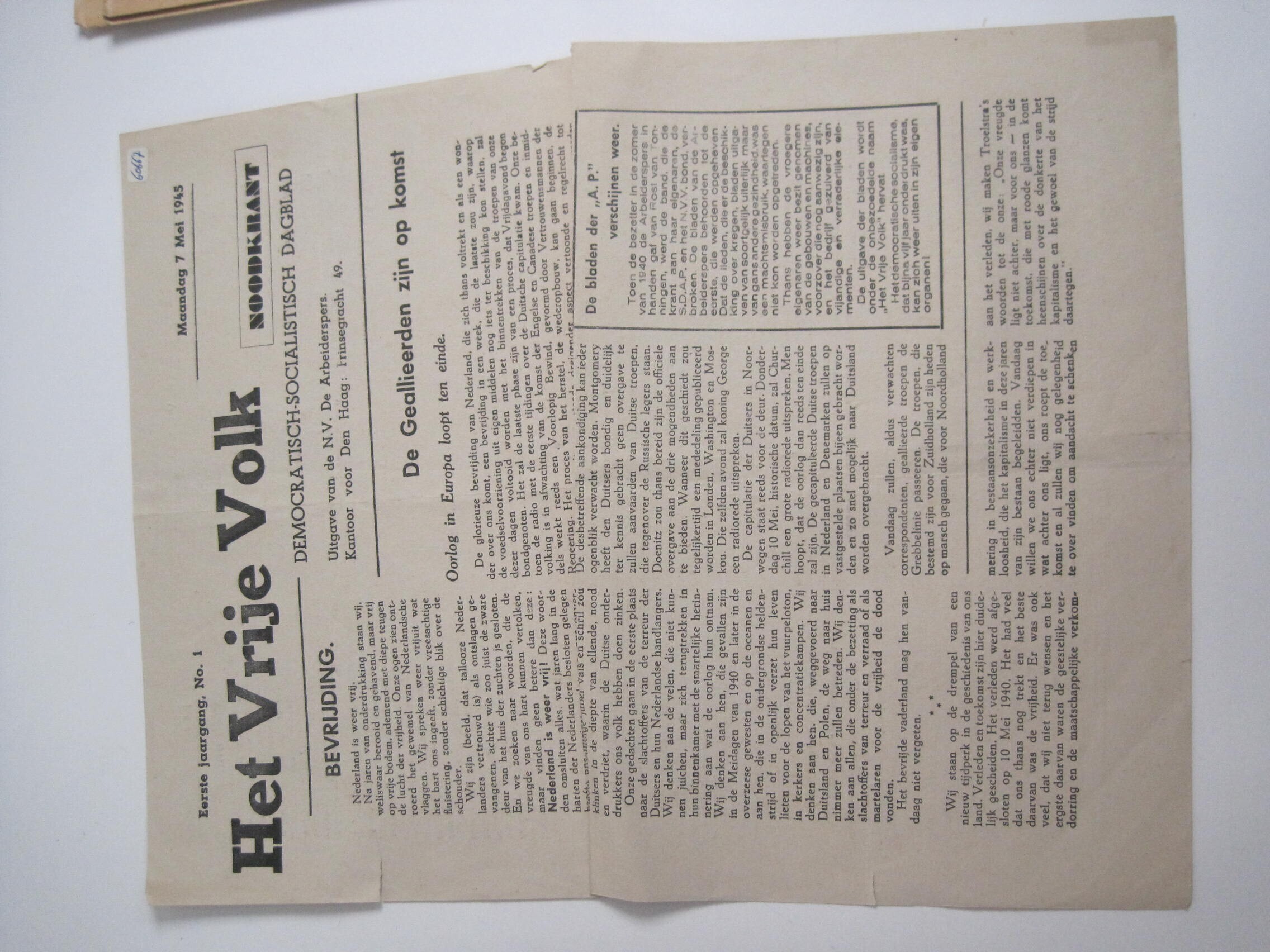 Het Vrije Volk<br>Eerste jaargang, no. 1.<br>7 mei 1945<br><br>