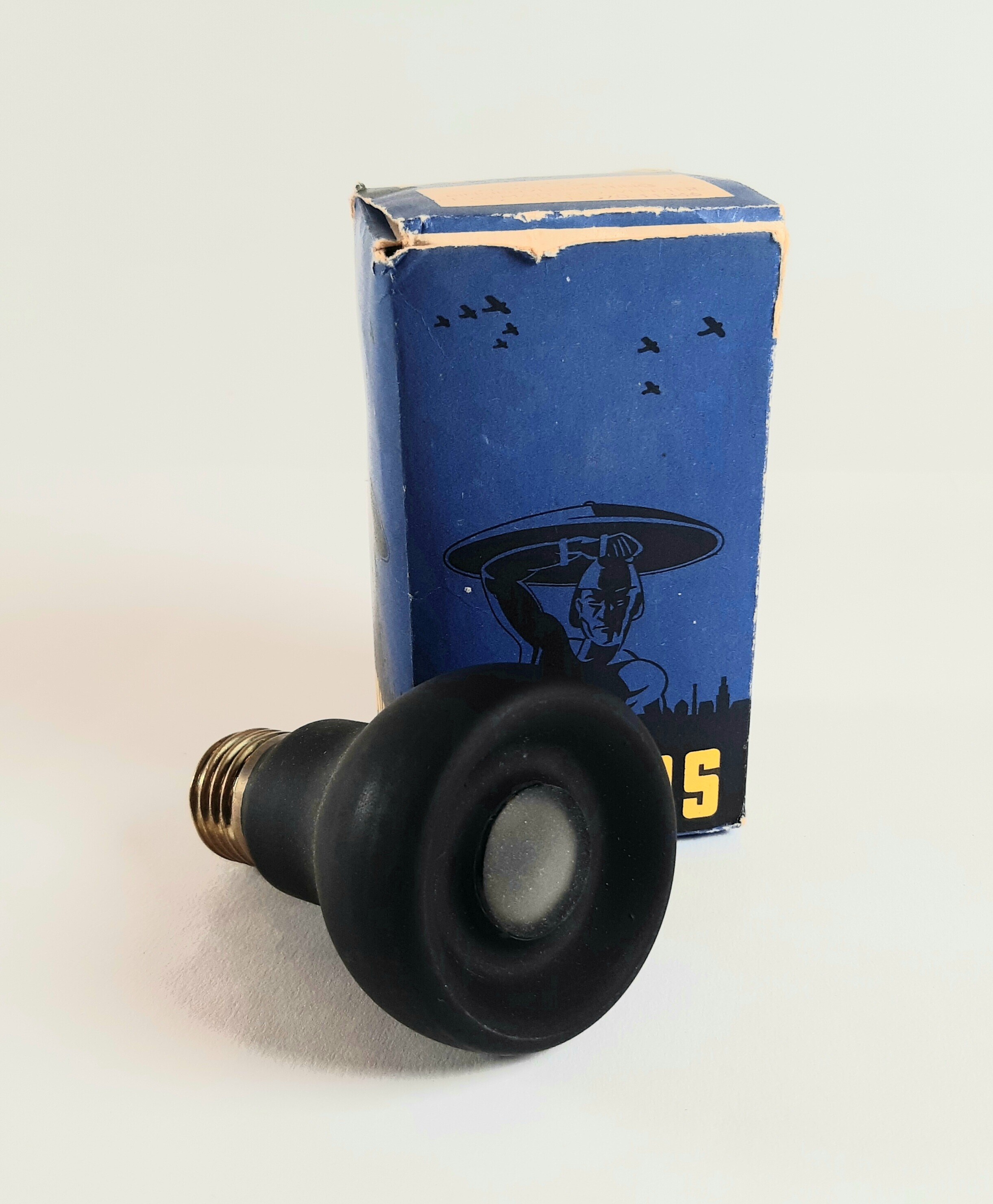 Een donkerblauw hard papieren doosje met in geel: "Phillips" en in zwart de afbeelding van een militair, die zijn schild in bescherming boven zijn hoofd heft. Boven hem vliegtuigen. Op de achtergrond de zwarte contouren van een stad. Op het deksel een stempel met de tekst: "220- ED. Protector binnenverlichting met gematteerd venster No. 9269.14370.11346". In de doos is een zwarte kogellamp met afgeplatte bol verpakt.