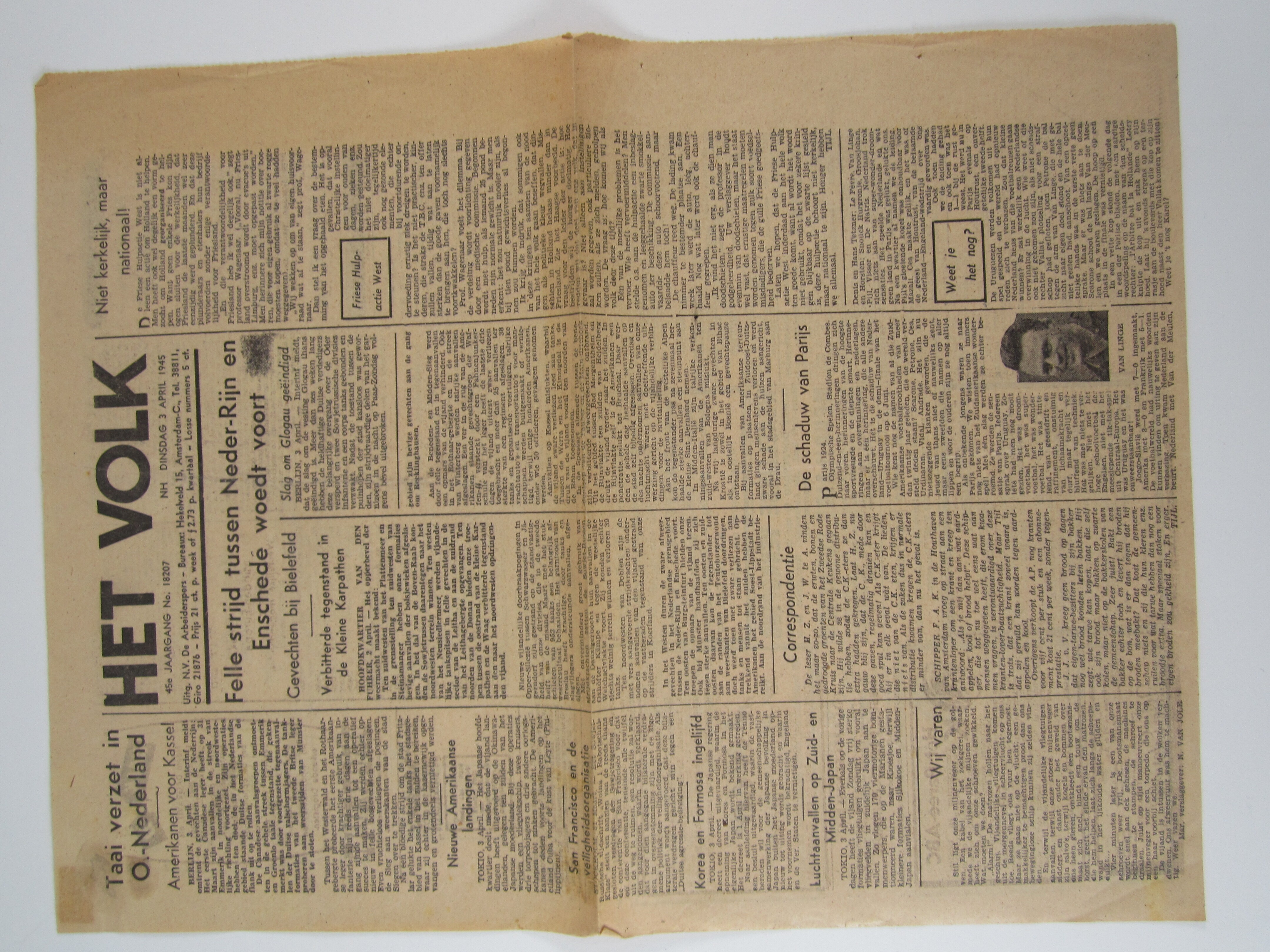 Exemplaar van het Volk, 45e jaargang nr. 18204: "Felle strijd tussen Neder-Rijn en Enschede woedt voort".