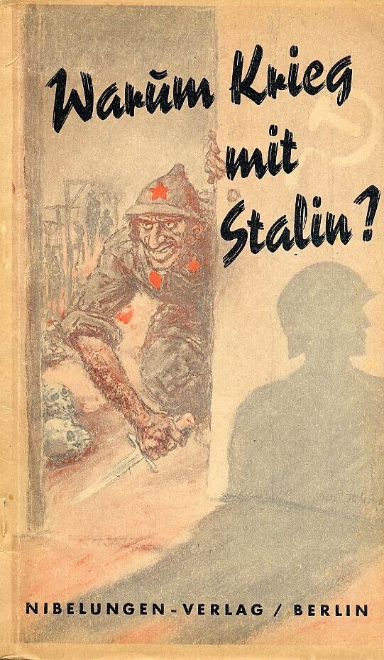 Twee exemplaren van een geïllustreerde Duitse uitgave van nationaalsocialistische signatuur. Op de kaft een afbeelding van een militair met Semitisch uiterlijk. Hij draagt een helm met een rode ster en sluipt met een dolk door een deur met het communistische symbool van hamer en sikkel. Onder dit symbool de schaduw van een soldaat met 'Arische' trekken. Door de opening van de deur zijn op de achtergrond galgen en schedels afgebeeld. De brochure telt 128 pagina's.