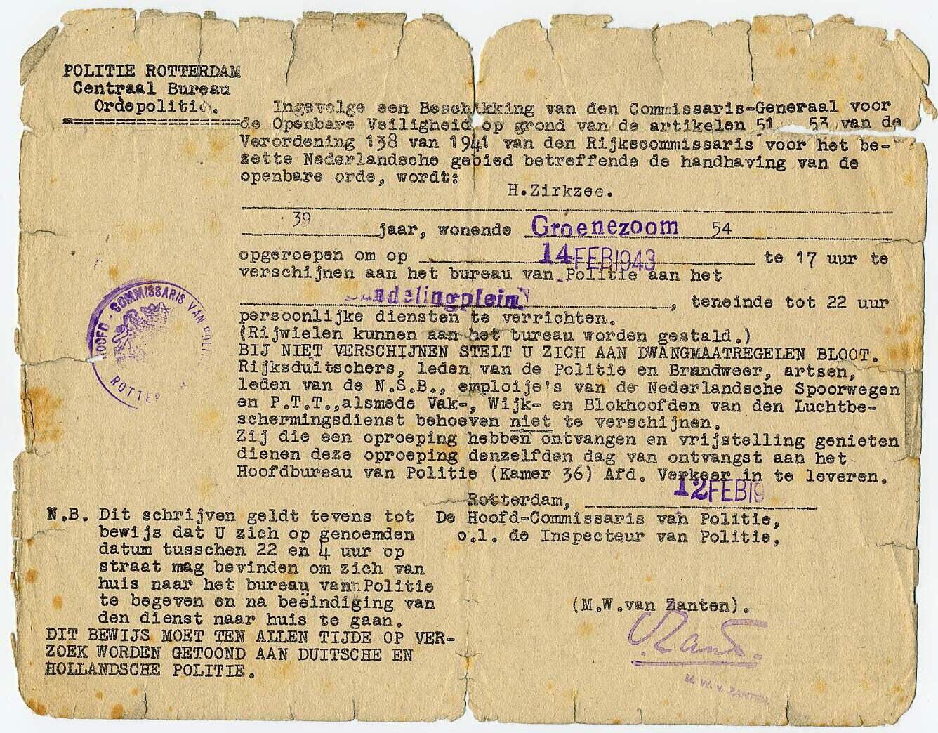 Viertal gestencilde documenten van de Staatspolitie Rotterdam, waarmee de ontvanger wordt opgeroepen zich te melden voor het verrichten van "persoonlijke diensten".