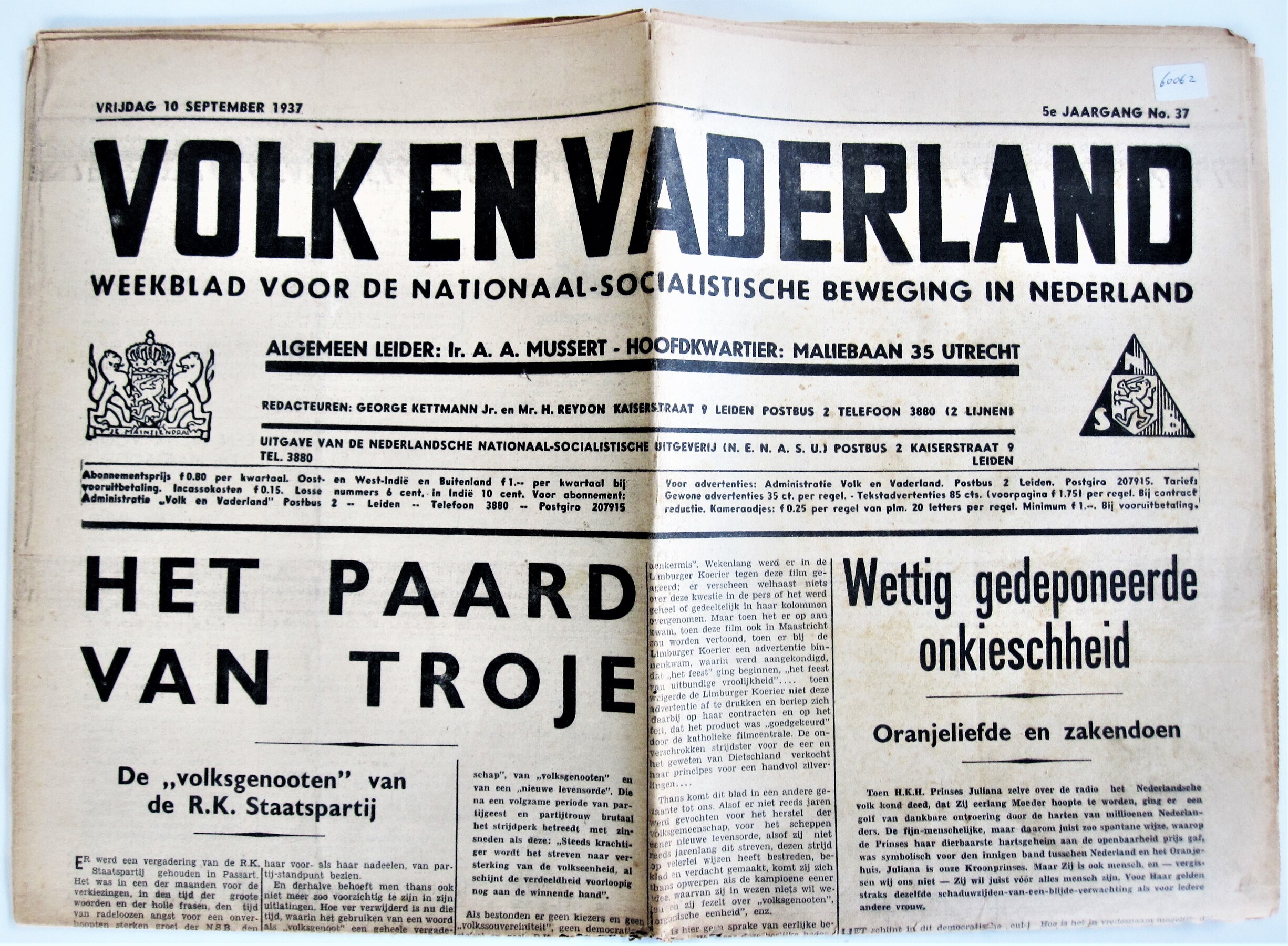 Editie van ''Volk en Vaderland'', nationaalsocialistisch weekblad van de N.S.B. Het betreft de vijfde jaargang nummer 37.
