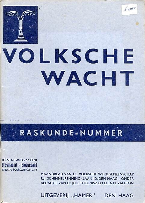 De Volksche Wacht was tussen 1936 en 1944 een maandelijks verschijnend tijdschrift, uitgegeven door de Nationaal-Socialistische Beweging (NSB) en bestemd voor NSB'ers. Het betreft twee exemplaren uit 1942, 7e jaargang No 1/2. Het onderwerp is Raskunde.