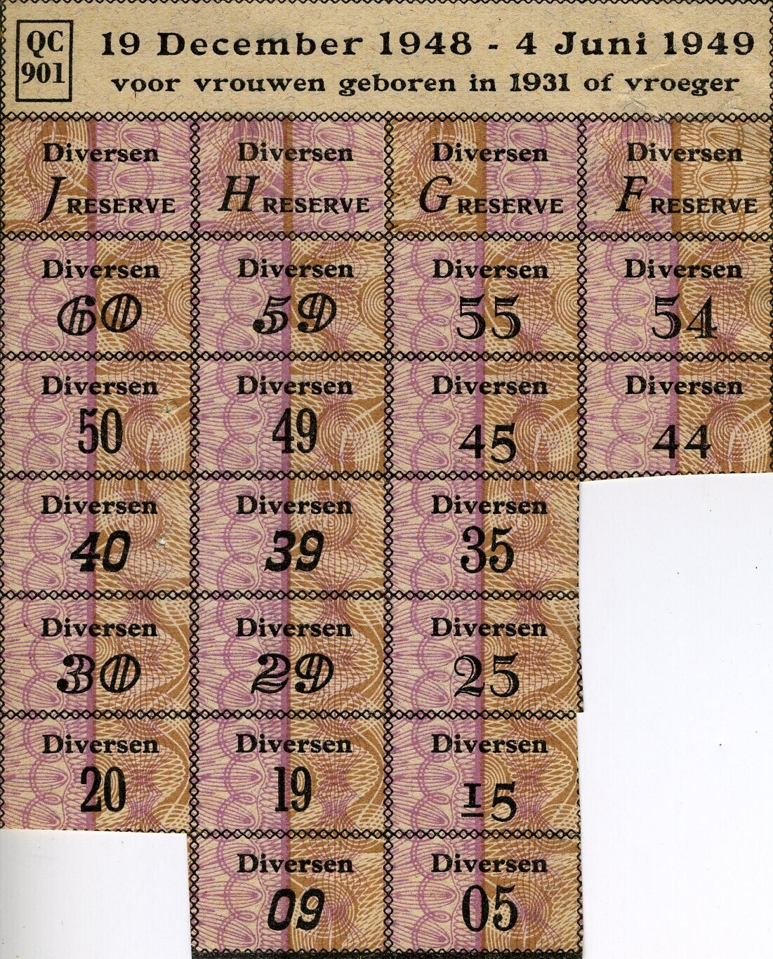 Twee deels gebruikte bonkaarten (QC 901) voor vrouwen geboren in 1931 of vroeger, geldig van 10 december 1948 tot en met 4 juni 1949.
