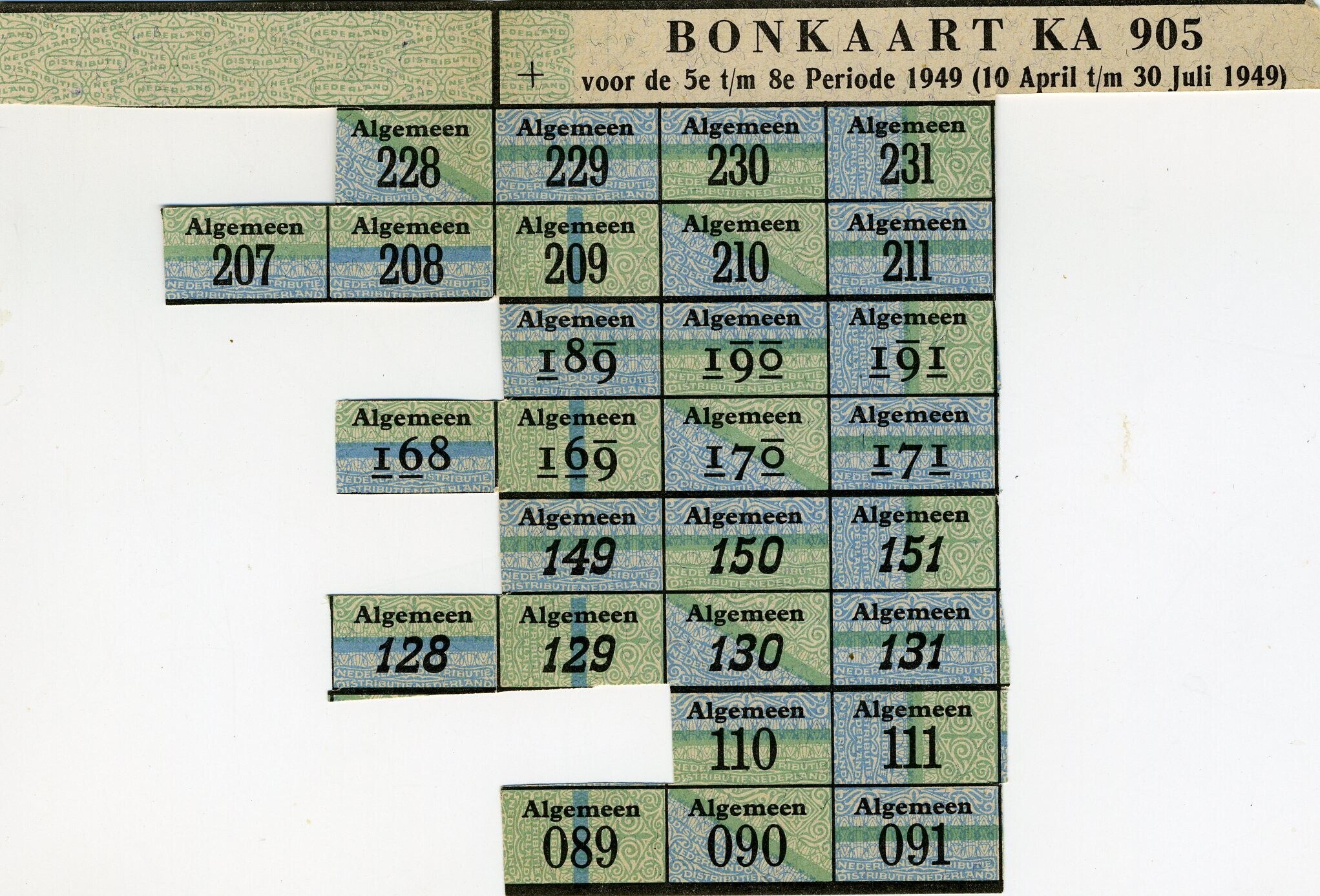 Drie deels gebruikte Bonkaarten KA 905 "Algemeen", geldig van 10 april tot en met 30 juni 1949.
