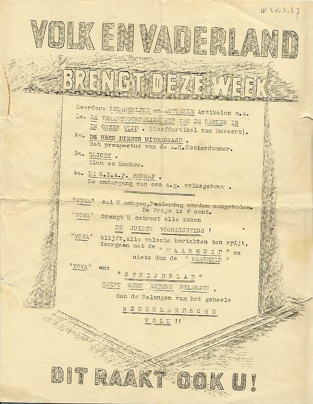 Gestencild document met een beknopt overzicht van de inhoud van Volk en Vaderland.