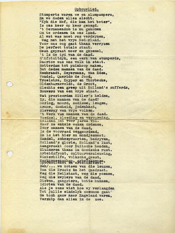 Blad met doorslag van een gedicht: "Stumperts waren we, slampampers en we deden alles slecht. Kijk die mof die kan het beter, is er keer op keer gezegd."